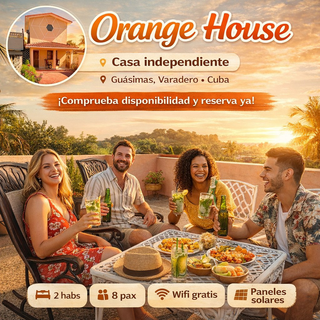 Orange House es una casa que se renta como alojamiento independiente ubicada en el pueblo de Guasimas a cinco kilómetros de Varadero. La entrada está delimitada por una valla alta, donde puede guardar su auto. Dispone de 2 habitaciones, una en el primer nivel y otra en el segundo. Tenemos un ventilador recargable en cada habitación. Servicio de Wifi de pago extra de 35 USD por paquete de 15 GB