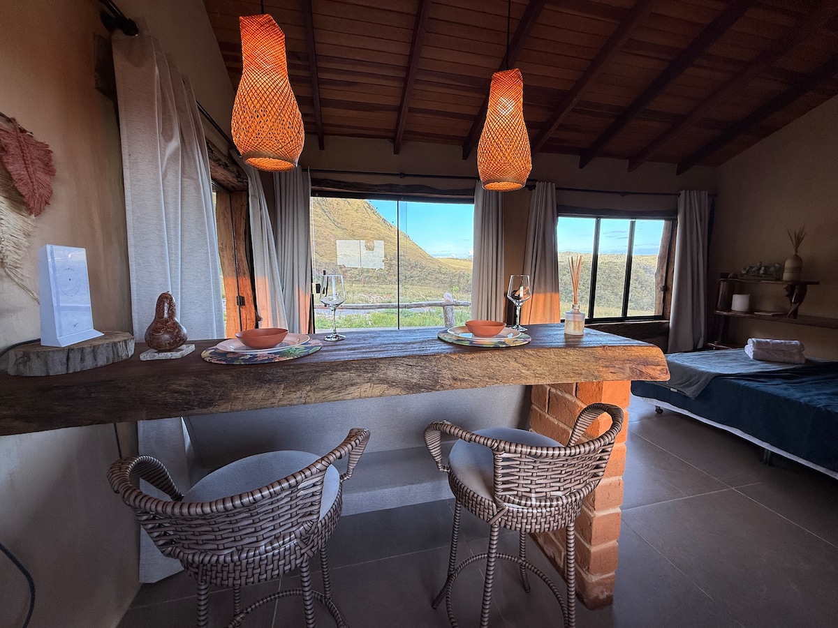 Nhà gỗ chalet của chúng tôi được tích hợp hoàn toàn vào thiên nhiên. Nó có khung kính lớn và giao diện miễn phí cho Cerrado và núi mang đến tầm nhìn ngoạn mục. Bếp đầy đủ, bộ đồ giường và bồn tắm hàng đầu, vòi sen nước nóng tuyệt vời, tủ quần áo và giường ngủ với nệm khách sạn 5 sao. Có ban công với một boong dọc theo toàn bộ chiều dài của nhà gỗ chalet ,với bàn và ghế bên ngoài để khách có thể ngắm nhìn thiên nhiên và bầu trời đầy sao của Chapada - tất nhiên là uống rượu vang. =)
