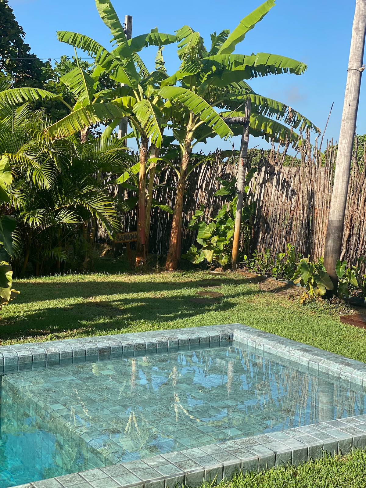 Tận hưởng hồ bơi, boong ướt, vòi sen ngoài trời. Khu vườn rộng 800 m2 có cây cối đẹp, bãi cỏ và cũng là một khu vực đầy cát lý tưởng để tận hưởng đêm và bầu trời đầy sao. Chuẩn bị lửa trại, nướng hải sản, nhảy múa dưới ánh trăng. Tổng cộng 150 m2 diện tích xây dựng với 3 nhà gỗ chalet/suite, phòng tắm xã hội, nhà bếp và bãi đỗ xe. Được thiết kế để tận hưởng một ngày với tất cả các công trình xây dựng được tích hợp vào hồ bơi và vườn hoặc một đêm ấm cúng.