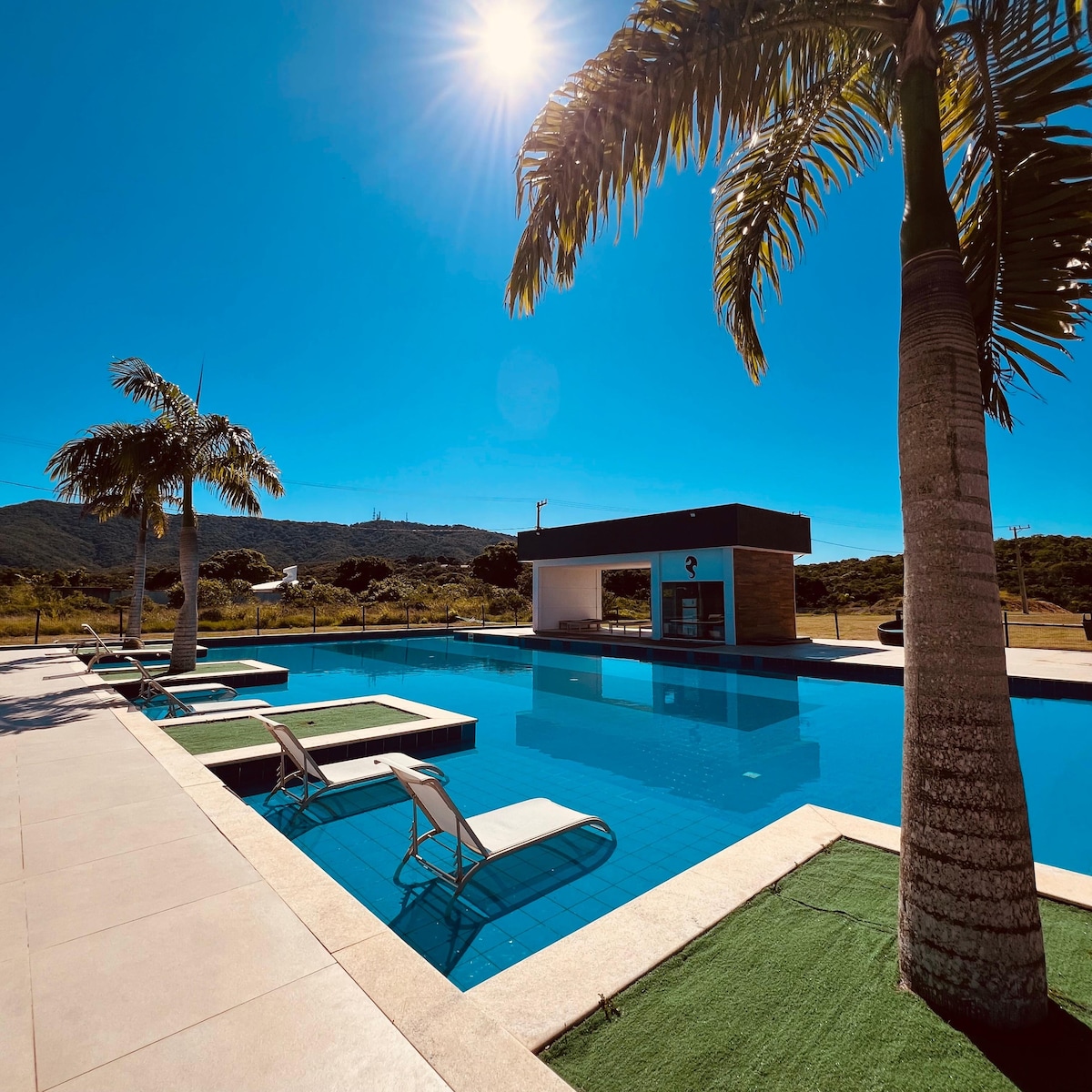 🌊 Ngôi nhà hai tầng trên cát tại Praia das Dunas! Không gian 2 phòng ngủ độc quyền với điều hòa không khí, internet, ban công nhìn ra biển, 2 phòng tắm, phòng khách lớn, nhà bếp đầy đủ và gara. Căn hộ chung cư cao cấp an toàn với các khu vực chung: phòng trò chơi và bếp nướng BBQ. Vị trí giữa Praia do Forte, Foguete và Arraial do Cabo. Sự thoải mái và riêng tư cho kỳ ở của bạn!