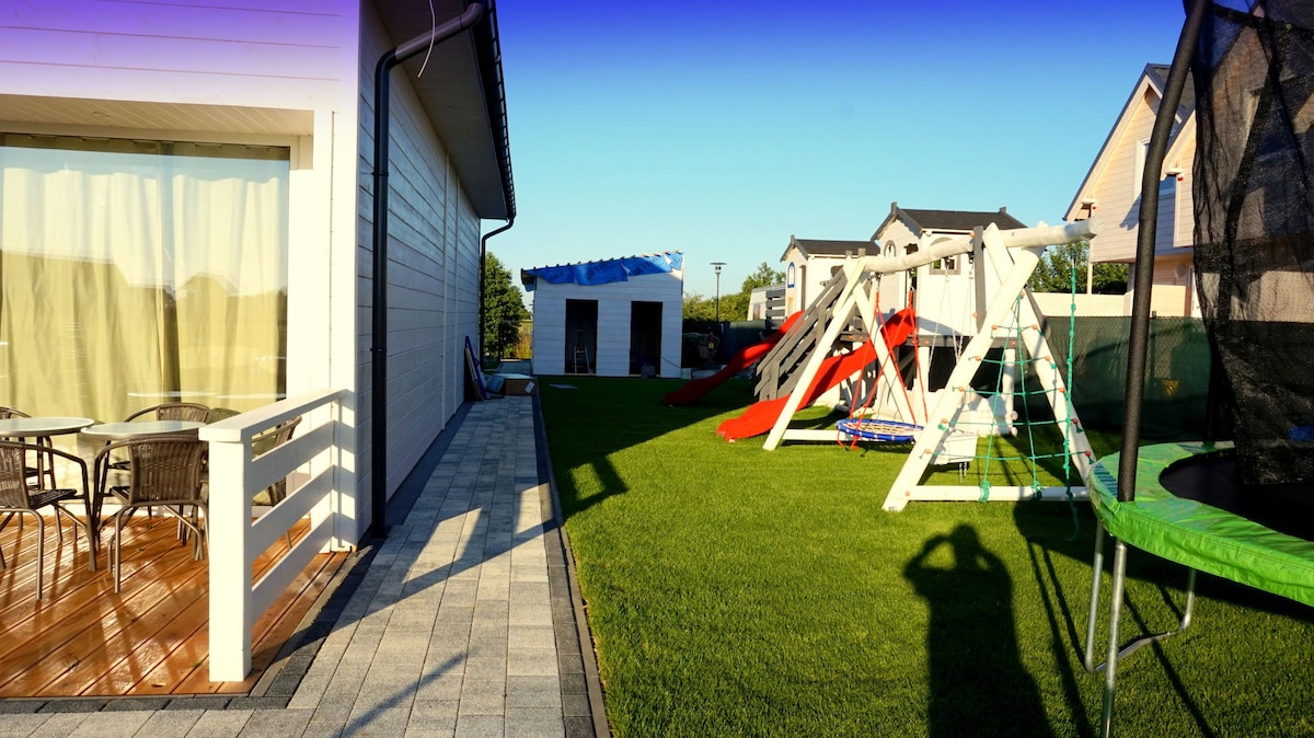 Ngôi nhà thoải mái 74 m2, có khu vực SPA riêng (bồn tắm nước nóng và phòng xông hơi khô - độc quyền, không tính thêm phí). Một lô đất có hàng rào mang đến cho bạn cảm giác về không gian và sự riêng tư của riêng bạn. 2 phòng ngủ (giường 160x200 cm trong mỗi phòng ngủ và giường sofa 120x190 cm). Cửa sổ toàn cảnh của một trong những phòng ngủ có tầm nhìn đẹp. Sân hiên có bếp nướng gas, bàn lớn và 6 ghế và ghế xích đu thoải mái. Ghế tắm nắng và màn hình bãi biển. 2 chỗ đỗ xe.