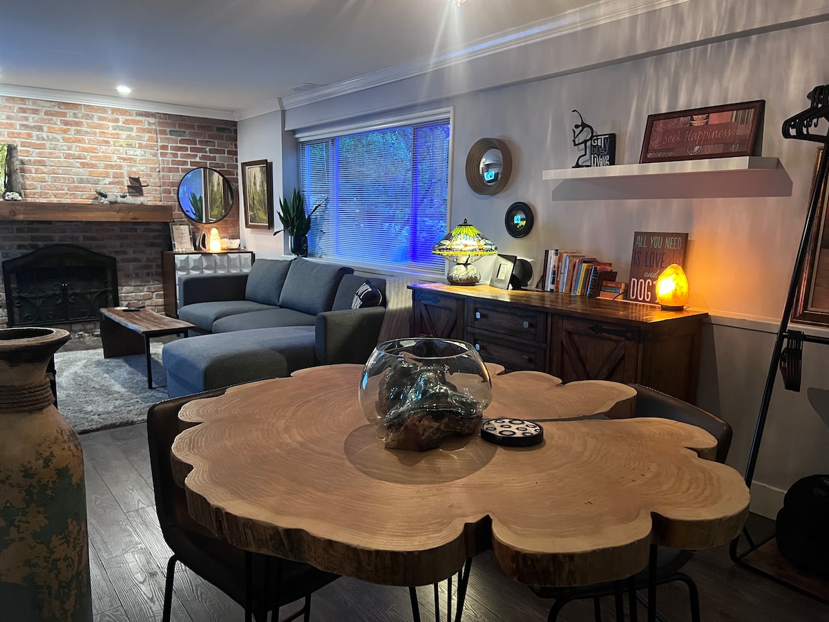 Một phòng suite rộng rãi với khu vườn đáng yêu, có nhà bếp đầy đủ tiện nghi, khu vực ăn uống/phòng khách thiết kế mở và phòng tắm riêng. Ngủ ngon trên giường Queen với ga trải giường trắng sạch sẽ và gối êm ái. Tận hưởng Wi-Fi miễn phí, xem các bộ phim Netflix yêu thích của bạn trên TV lớn với lò sưởi điện ấm áp. Cà phê buổi sáng và chai nước là miễn phí! Nằm trong khu phố yên tĩnh với chỗ đỗ xe miễn phí. Cách bến phà Tsawwassen 20 phút lái xe. Cách sân bay YVR 30 phút lái xe.