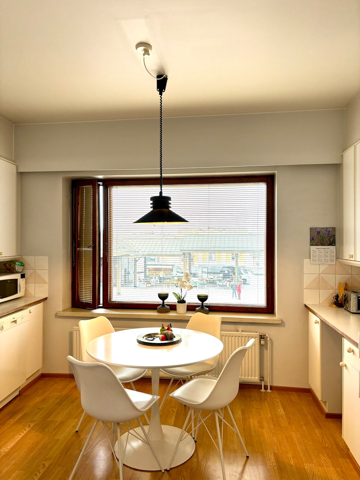 Căn hộ phong cách ở giữa Rauma cũ. Nhà bếp, phòng tắm và phòng ngủ/phòng khách rộng rãi ở tầng dưới. Phòng chờ trên lầu, phòng xông hơi khô, nhà vệ sinh và phòng tắm. Căn hộ này có tầm nhìn tuyệt vời ra thị trường. Tất cả dịch vụ bên cạnh. Vị trí không được tốt hơn! Ngôi nhà yên bình, không có căn hộ nào khác trong cầu thang này. Một nơi để xe trong sân.