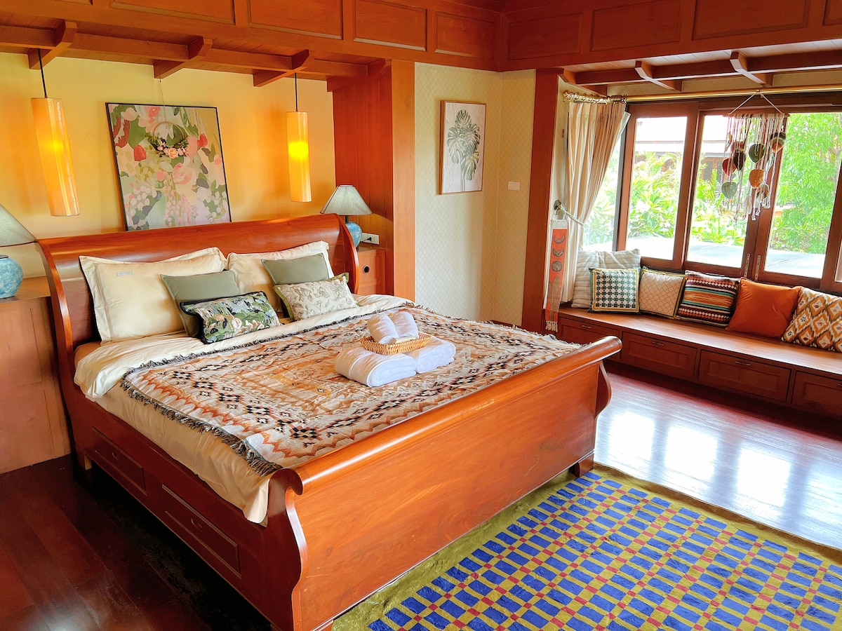 In the bustling location of jomtien Beach, 1 minute walk from the beach, close to 711 convenience store, there is a special swimming pool for villas, parties can be held, 4bedrooms can accommodate more than 10people, and there is one tatami, and there is also an extra bed. It is no problem to accommodate more than 10people. , Thai style decoration, and there are many online celebrity restaurants near villas