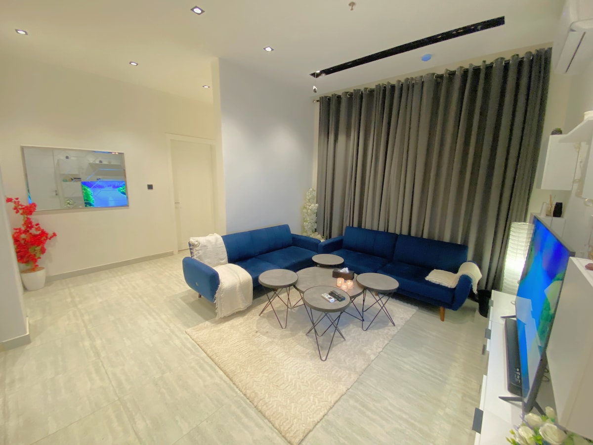 Căn hộ nằm ở một trong những khu phố uy tín nhất phía bắc Riyadh, là khu phố mùa xuân và được thiết kế với nội thất sang trọng mới nhất và có màn hình thông minh 75 inch và Internet tốc độ cao và máy pha cà phê Nespresso. Căn hộ được đặc trưng bởi sự tự vào và hoàn toàn riêng tư và nằm ở phía trước lối đi phức tạp và cách Đại lộ Riyadh 15 phút và cũng cách Trung tâm tài chính King Abdullah 10 phút và cách Sân bay Quốc tế King Khalid 15 phút. Ngoài ra còn có đăng ký ( Netflix - Shahid ) Khách có quyền tự nhận phòng