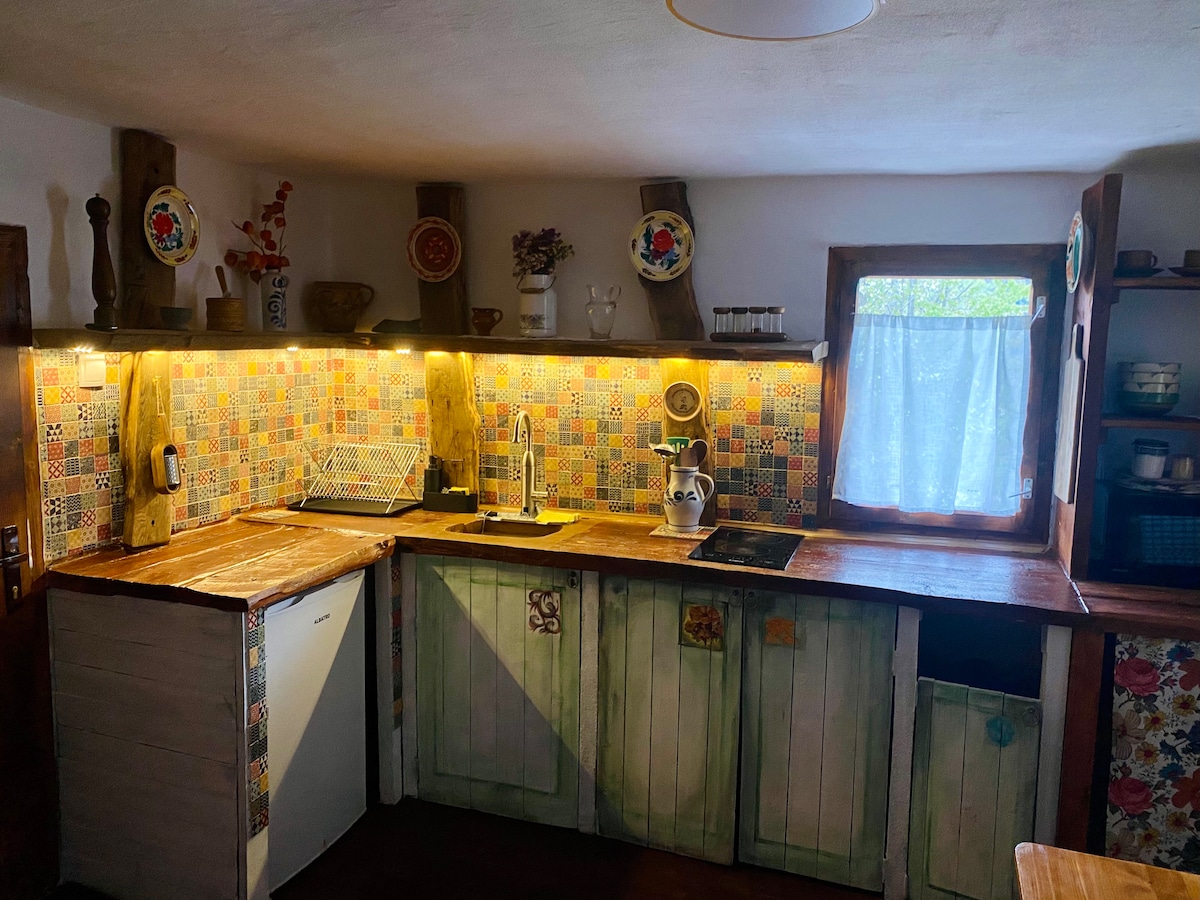 Ngôi nhà tự nhiên, ẩn mình trong sườn núi,nằm trong khung cảnh cổ tích. Trải nghiệm tử tế!Vị trí khoảng 5 ha mời bạn thư giãn, nghỉ ngơi và kết nối lại với thiên nhiên. Nhà nghỉ thôn dã, mát mẻ vào mùa hè và ấm áp vào mùa đông,được thiết kế để đảm bảo sự thoải mái tối ưu trong bất kỳ mùa nào. Với diện tích 30 m2, phòng tắm riêng, giường đôi, bếp củi và sân thượng rộng rãi,nó cung cấp một kỳ nghỉ thực sự độc đáo. KHU VỰC HÚT THUỐC này cách xa các ngôi nhà. Bếp ngoài trời được chia sẻ giữa hai ngôi nhà.
