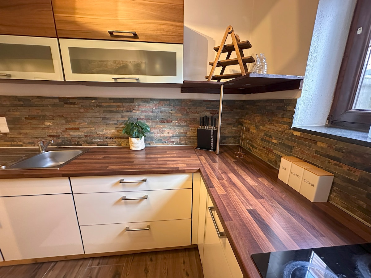 Cozy basement apartment with spacious living room, stylishly furnished with charming old wooden furniture. The fully equipped fitted kitchen offers everything you need for everyday comfort, from coffee machine to ceramic hob and dishwasher. The modern, recently renovated bathroom has a walk-in shower. In addition to a separate bedroom (double bed), there is also a sofa bed. Outside, a terrace surrounded by greenery invites you to relax.