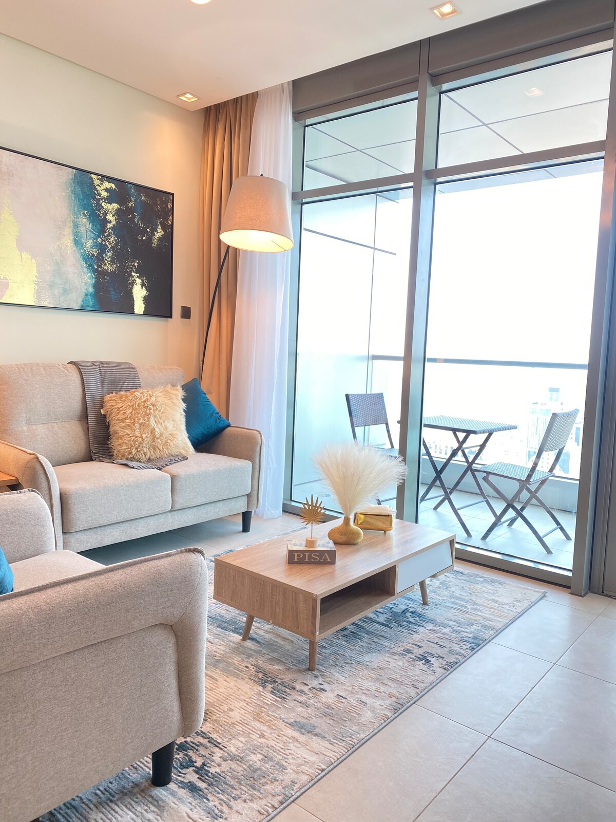 Căn hộ nằm trong một tòa nhà cao tầng trong tầm nhìn ra biển và thành phố. Nó bao gồm một phòng ngủ, một nhà bếp mở và một phòng khách. Nó có một số tiện nghi tốt nhất trong khu vực bao gồm hồ bơi, khu vực BBQ, rạp chiếu phim, v.v. nằm ở vị trí thuận tiện gần Juffair Mall, Oasis Mall, hiệu thuốc và cửa hàng giặt ủi,Juffair là một khu phố quốc tế sôi động nổi tiếng với các quán bar, nhà hàng và quán cà phê, và gần Pháo đài Bharain, Bảo tàng Quốc gia và cách Sân bay Bahrain 16 phút.