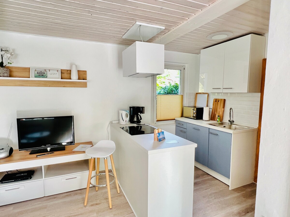 Kleine Maisonette-Ferienwohnung in einer Ferienanlage mit 4 Häusern à 6 Wohnungen. Die Küche ist voll ausgestattet mit Herd, Microwelle, Singlespülmaschine, Toaster, Wasser- und Eierkocher, einer Dolce-Gusto-Kaffeemaschine und Geschirr für bis zu 6 Personen. Ein Kinderreisebett und ein Kinderhochstuhl ist vorhanden. Eine Waschmaschine und ein Trockner ist im Keller vorhanden, diese werden jedoch von allen Bewohnern gegen Entgelt/Münzautomat genutzt. Ein Parkplatz ist vorhanden.