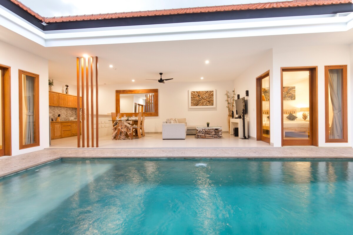 Biệt thự mini hiện đại 2 phòng ngủ với không gian sống mở ngay trung tâm Seminyak, Bali. Lựa chọn hàng đầu cho bất kỳ ai muốn tận hưởng bầu không khí yên tĩnh nhưng không muốn tách biệt khỏi sự hối hả và nhộn nhịp. Giường cỡ King, điều hòa nhiệt độ và phòng tắm trong mỗi phòng, bếp được trang bị đầy đủ cộng với màn hình internet nhanh sẽ giúp bạn thoải mái khi thư giãn trong biệt thự. Chúng tôi thậm chí còn chưa đề cập đến hồ bơi riêng có tầm nhìn ra vườn nhiệt đới mà bạn có thể tận hưởng bất cứ lúc nào bạn muốn.