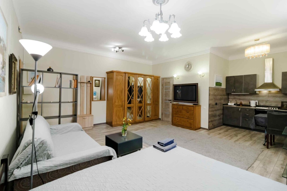 🌿 Tranquil, spacious 48 m² designer studio in leafy Lypky — Kyiv’s historic heart. 🏛️ Prestigious government district — secure and well-protected area. ⚡ Reliable 24/7 electricity with no outages. ❄️🔥 Warm year-round: Cooper&Hunter AC (−25°C to +50°C) + heated bathroom floors. ☕ Fully equipped kitchen & drinking water cooler. 🧺 Washing machine + separate dryer. 🔑 Easy self check-in anytime.