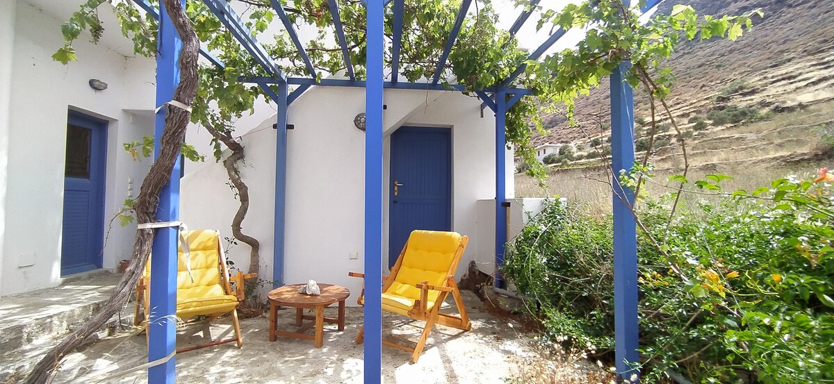 It's a cottage house on a very quiet and peaceful place on the northeast side of the island. You have an amazing view to the Aegean Sea, which gives you the opportunity to relax and rest while being on your vacation. There is one master bedroom with a queen bed with a Grecostrom Bodytopia Series matress and two single beds in the resting area which is shared with the kitchen. It's also fully equipped kitchen and a bathroom, which will give you the ability to enjoy your vacation at your own pace.