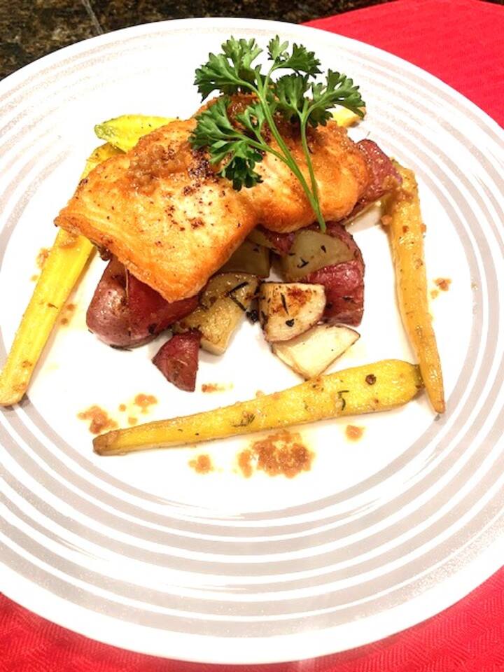 Thưởng thức thực đơn bữa trưa nhiều món với cá hồi nướng, cà rốt ba màu nướng, khoai tây hương thảo và nước chanh lấp lánh.