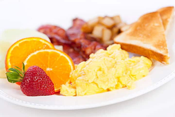 Bữa sáng kiểu Mỹ cổ điển này bao gồm trứng chiên, thịt xông khói táo, khoai tây chiên và bánh mì nướng.