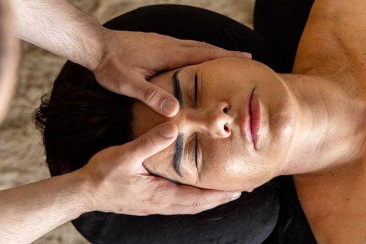 Tôi xoa bóp vùng thái dương, da đầu và cổ của bạn một cách trực quan, giúp khuôn mặt của bạn trở nên mềm mại, săn chắc và thoải mái hít thở trở lại.