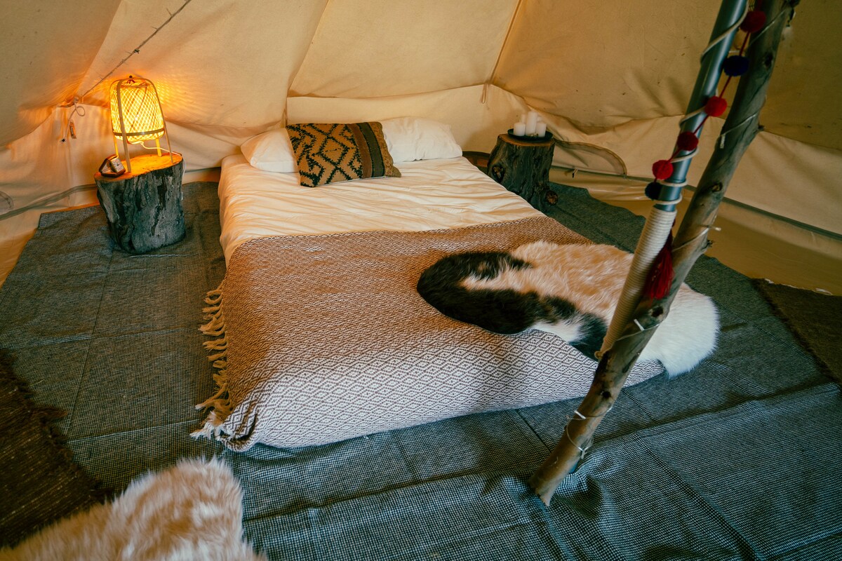 Our TIPI TENT is more than just a tent—it’s an experience! Inspired by traditional Sioux dwellings, this cozy hideaway brings a sense of adventure with all the comforts of home. Inside, a comfy double bed (futon style) awaits, with soft lighting creating a warm retreat. Right next to it, a private wooden cabin has a fully equipped kitchenette, a bathroom, and a closet. A stay in the TIPI is about slowing down, embracing nature, and adding a little magic to your getaway.