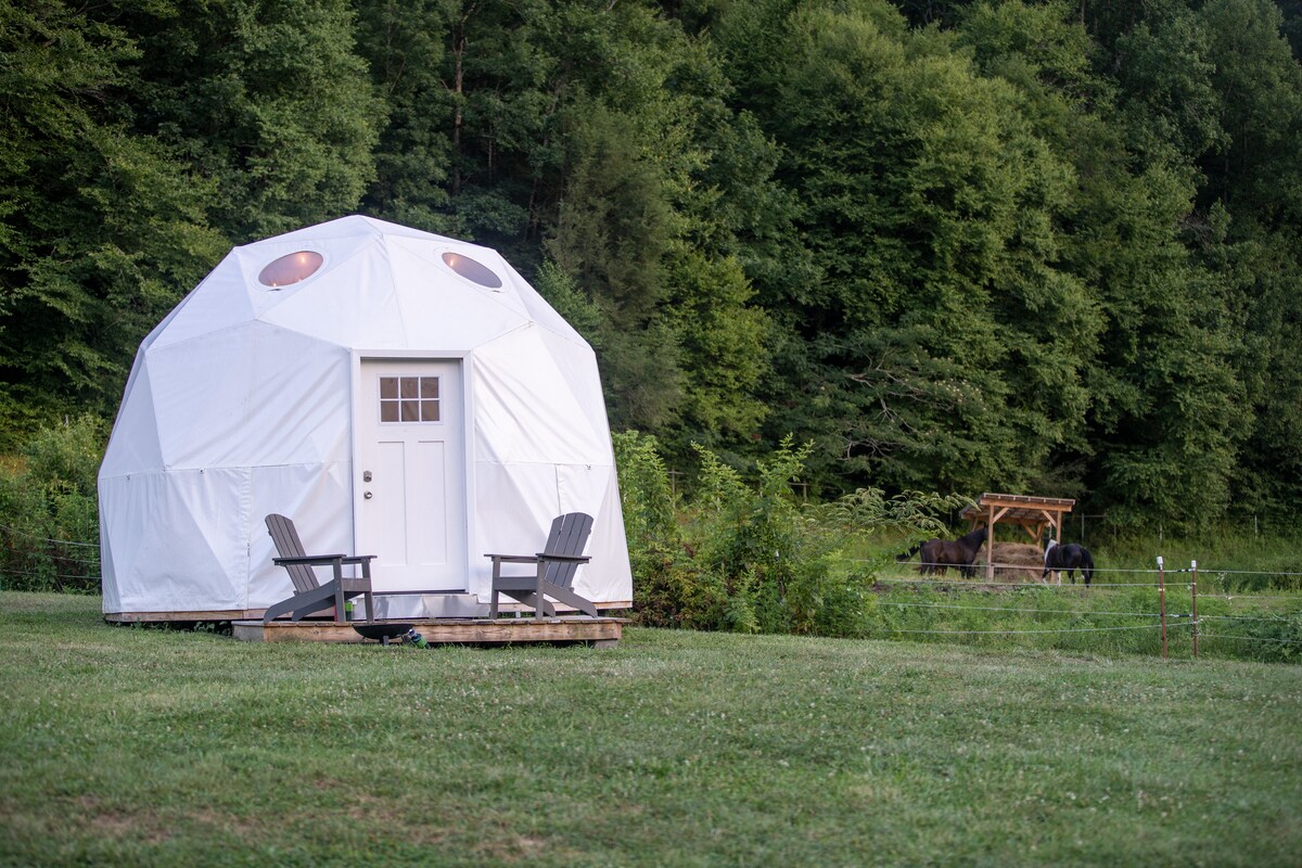 ***Hiện có sẵn để đặt phòng *** Ở trong một trang trại rộng 140 mẫu Anh tại địa điểm trú ẩn duy nhất có mái vòm cắm trại trong Dãy núi Khói và trở về với thiên nhiên! Nhìn ra cửa sổ vào rừng, đỉnh núi và bầu trời. Thư giãn trên hiên nhà nhỏ và tận hưởng hố lửa propan ấm áp. Nằm trên chiếc giường cỡ Queen thoải mái và chìm vào giấc ngủ trong khi ngắm vẻ đẹp của bầu trời đêm!