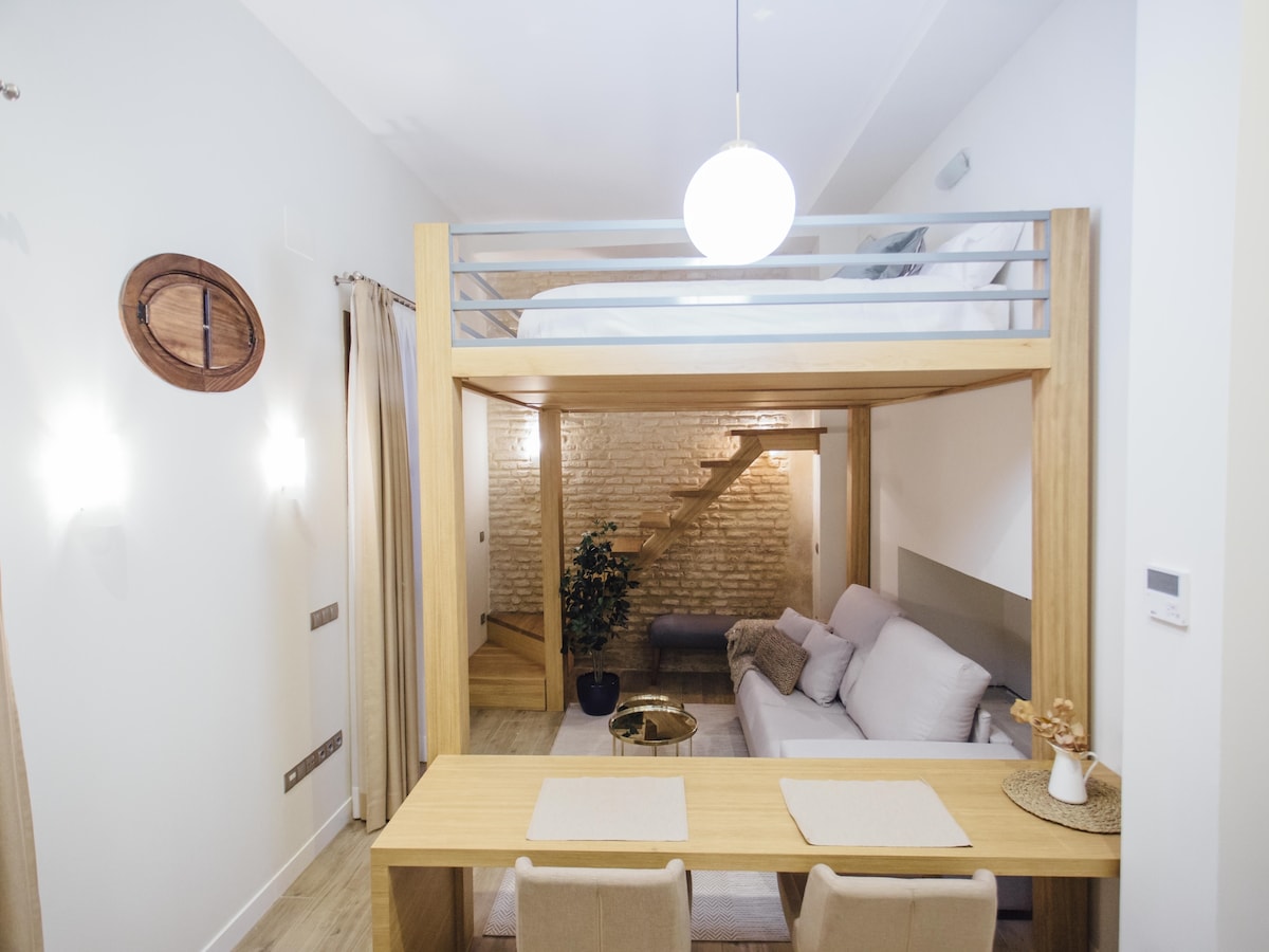 Experience the best of Seville from this premium flat located in the historic Barrio Santa Cruz. Steps away from the Alcázar, the Cathedral, and vibrant tapas bars. This apartment places you in the center of Seville's rich culture and lively atmosphere. Dive into an urban oasis where rustic charm meets industrial modernity. This renovated apartment in Sevilla, with access to a shared rooftop pool, is a space where comfort and aesthetics unite to create an unforgettable accommodation experience.