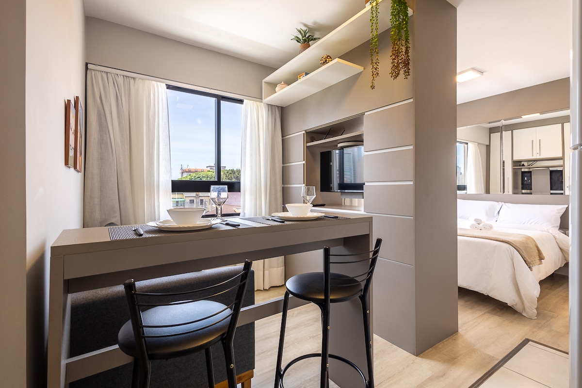 Bem-vindos. Este studio recém-inaugurado foi preparado com carinho para que você se sinta em casa em Curitiba. Os tons neutros, a marcenaria funcional e a iluminação suave deixam o ambiente leve e tranquilo. Aqui você pode descansar, trabalhar com calma e aproveitar a cidade com praticidade. O MUV Residence está em uma região central, com fácil acesso a hospitais, universidades, restaurantes e atrações locais. Este studio não possui garagem, mas há a opção de estacionamento pago no prédio.