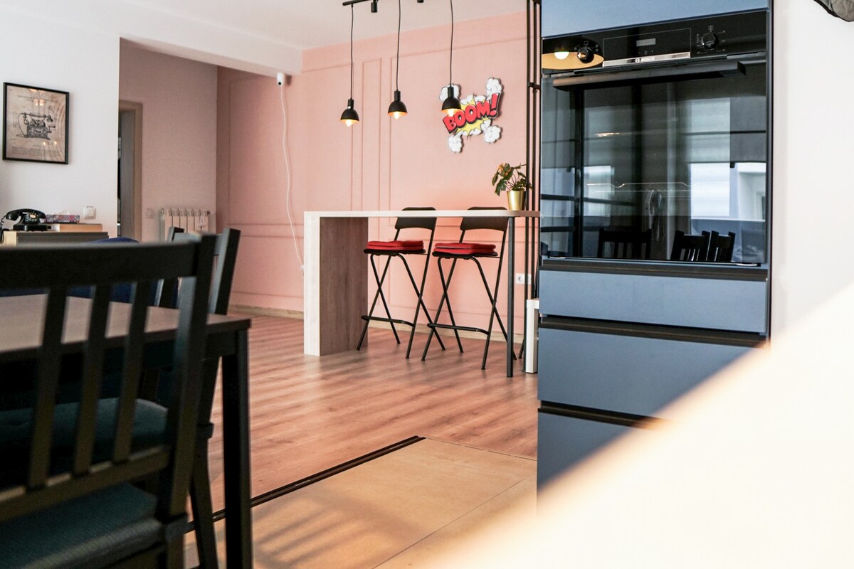 Nơi ẩn náu sang trọng và yên tĩnh ở trung tâm lịch sử của Sibiu — ★ chỉ cách ga tàu 10 phút đi bộ và cách quảng trường chính, bảo tàng và các địa danh địa phương vài bước chân. Tận hưởng sự quyến rũ ấm áp của một tòa nhà di sản, xung quanh là các quán cà phê ấm cúng và nhà hàng thủ công. Chỗ đỗ xe trên đường phố ★ miễn phí gần đó (tùy thuộc vào tình trạng còn phòng); các tùy chọn trả phí cũng đóng cửa. ★ Tự nhận phòng qua hộp khóa an toàn nếu cần. ★ Điều hòa nhiệt độ, TV thông minh với Netflix và Wi-Fi 1 Gbps.