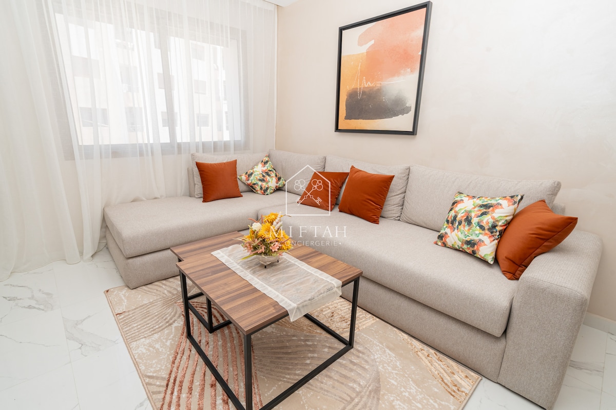 ✨️LE GLORIOUS✨️ Détendez-vous dans ce logement calme et élégant. Joli appartement à deux pas du GRAND STADE de Tanger Agréable et apaisant, l’appartement se compose d’un salon élégant ensoleillé avec une chambre (lit neuf 180) La salle de bain est propre et fonctionnelle Parfaitement équipé, calme et imprégné d'une ambiance cocooning, ce sera le point de chute idéal des voyageurs d’affaires et d’agrément