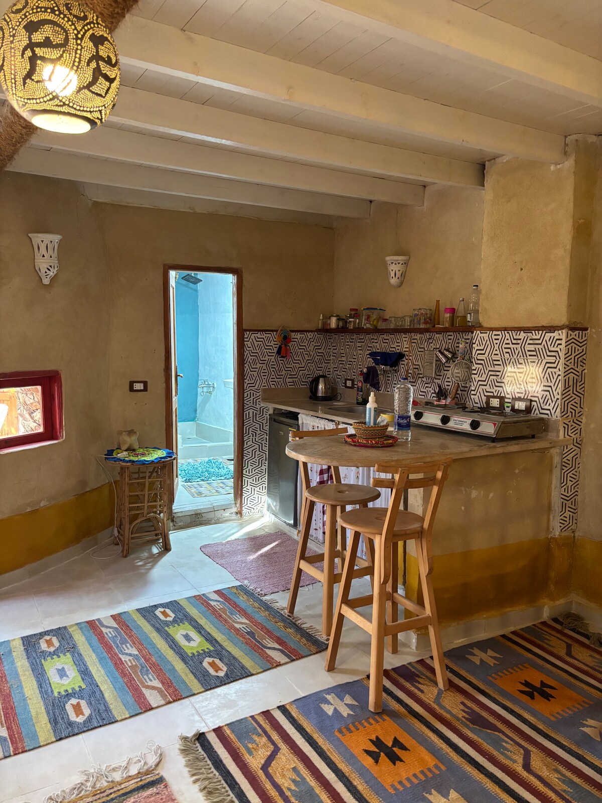 Step into a warm, wooden cozy apartment designed for comfort and relaxation. Surrounded by natural materials and soft lighting, this space offers a peaceful retreat after a day exploring Siwa. The apartment features a comfortable bed, a sitting area, and thoughtfully selected décor that blends nature with simplicity. Ideal for couples or solo travelers seeking calm, privacy, and authentic oasis vibes.