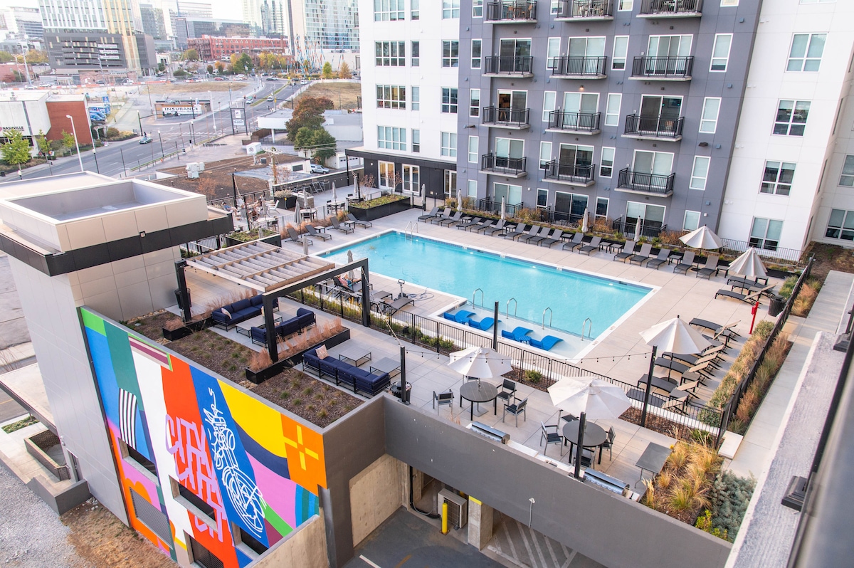 Chào mừng bạn đến với Music City! Hãy đến ở trong căn hộ chung cư lớn nằm ở trung tâm thành phố Nashville của chúng tôi và cách Broadway và các điểm tham quan địa phương khác 6 phút đi bộ. Tận hưởng khung cảnh thành phố từ ban công hoặc phòng chờ trên bầu trời, dành những ngày hè nóng bức bên hồ bơi hoặc đi ra Broadway! Căn hộ có một chỗ đỗ xe dành riêng trong tòa nhà với giá rẻ! - Trung tâm thành phố âm nhạc - 0,1 dặm -Bridgestone Arena - 0,4 dă ̣ m -Broadway - 0,4 dă ̣ m - Sân vận động Nissan - 1 dặm