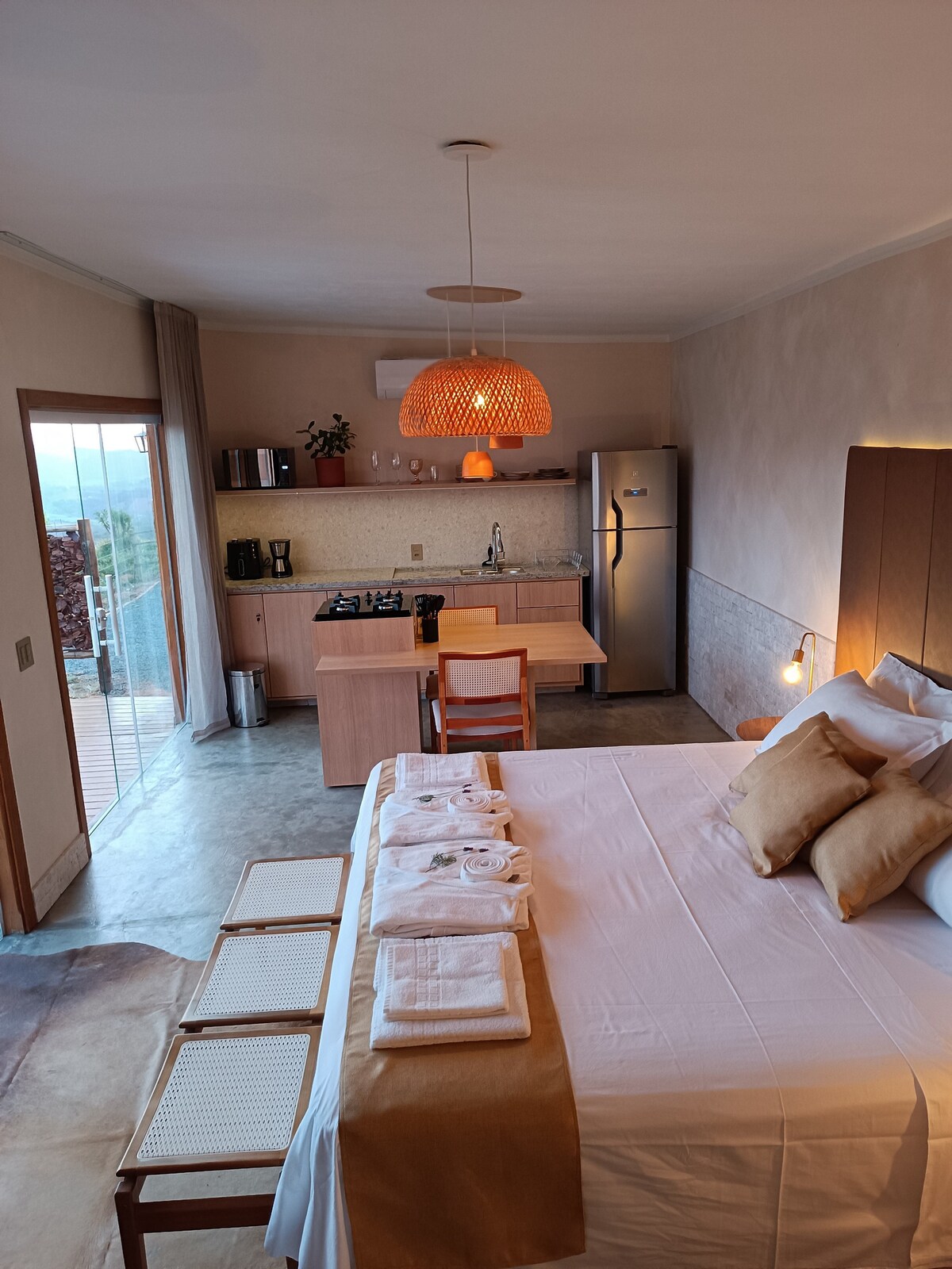 PET FRIENDLY. Chalé charmoso em conceito aberto, perfeito para relaxar nas montanhas. Conta com deck exclusivo e vista deslumbrante para apreciar as montanhas da Mantiqueira. Possui cama King com enxoval premium, cortinas blackout, ar-condicionado quente e frio, TV 50”, cozinha completa (fogão com forno, geladeira espaçosa com freezer, micro-ondas, sanduicheira e utensílios), banheiro com chuveiro a gás e estacionamento privativo. Conforto e aconchego para uma escapada romântica inesquecível!