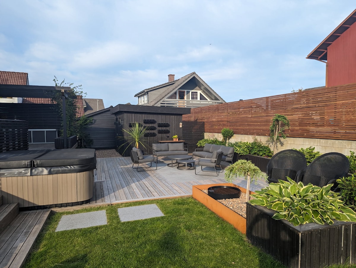 Relax in a private jacuzzi on a secluded outdoor terrace, perfect all year round. Enjoy calm evenings with ambient lighting, plenty of space and a private atmosphere. Modern and comfortable home for couples, friends or families. Three bedrooms with double beds; travel cot on request. Parking with EV charger included. Public transport nearby takes you to the city center in about 15 minutes. Grocery stores close by. Cat in the house; can stay in the laundry room with separate entrance if desired.