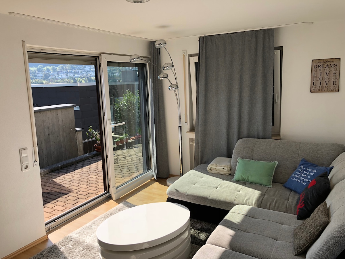 Căn hộ nằm trong một ngôi nhà một gia đình và nằm trong một ngõ cụt trong khu dân cư yên tĩnh. Căn hộ 2 phòng với diện tích khoảng 40 m2 được trang bị đầy đủ tiện nghi và đầy đủ tiện nghi. Căn hộ có thể chứa 3 người và lý tưởng cho gia đình, khách đi công tác, sinh viên và người tìm kiếm giải trí. Căn hộ bao gồm bãi đỗ xe, lối vào riêng biệt, sân thượng đầy nắng với chỗ ngồi và quang cảnh tuyệt vời của Swabian Alb.