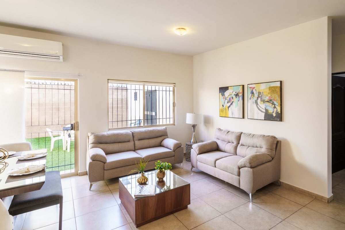Disfruta una estancia premium en esta casa dentro de cerrada con acceso controlado, ideal para 7 personas. Ubicada a solo 5 min del estadio de béisbol y 7 min del aeropuerto. Cuenta con 3 recámaras elegantes (2 con cama queen y Smart TV con Netflix, 1 con litera matrimonial e individual), 2 baños completos, sala confortable y cocina totalmente equipada. Relájate en el patio con asador disfruta alberca, gim y áreas recreativas. Incluye wifi de alta velocidad, climatización, lavadora y secadora.
