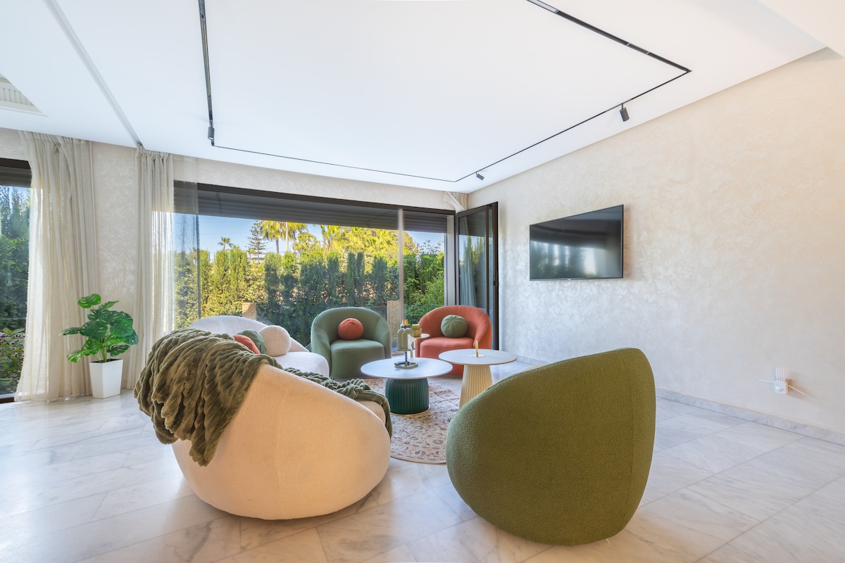 Tận hưởng kỳ nghỉ tại biệt thự sang trọng dành cho 8–10 người của chúng tôi, kết hợp giữa thiết kế hiện đại và nét quyến rũ của Ma-rốc. Tận hưởng 4 phòng ngủ thanh lịch, phòng tắm hammam bằng đá cẩm thạch riêng, khu vườn cảnh quan rộng lớn và quyền sử dụng hồ bơi chung. Nằm trong một khu dân cư an toàn gần Golf du Soleil, biệt thự này mang đến sự thoải mái 5 sao với điều hòa không khí và cáp quang. Ốc đảo hoàn hảo để thư giãn tuyệt đối.