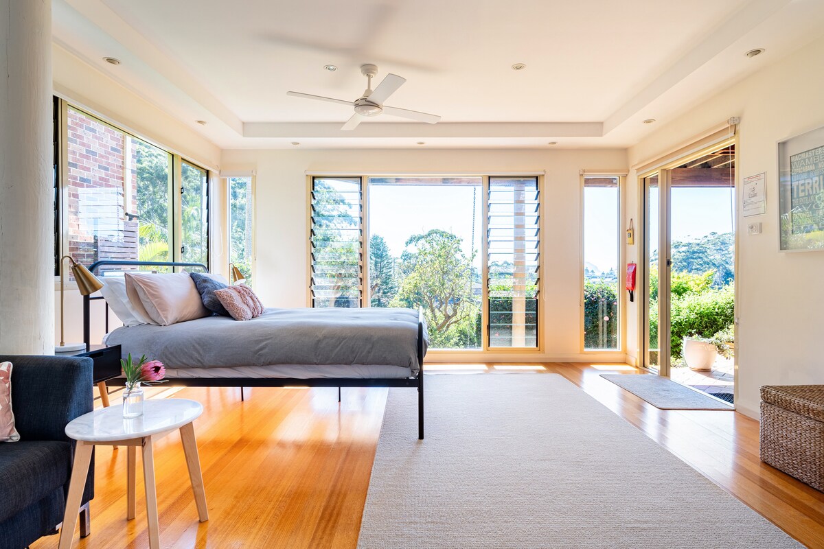 Toàn bộ Căn hộ Studio quá khổ HOÀN TOÀN RIÊNG TƯ VỚI LỐI VÀO RIÊNG không CÓ PHÍ VỆ SINH hoặc DỊCH VỤ BỔ SUNG phù hợp cho các cặp đôi hoặc người độc thân, giường cỡ Queen, bếp nhỏ (không có lò nướng) và bữa sáng nhẹ được cung cấp hàng ngày, tầm nhìn ra nước lọc và nằm ở trung tâm biên giới của Vịnh Booker. Bãi đỗ xe ngoài đường, Ettalong, Marina, Palm Beach Ferry, Rạp chiếu phim, Câu lạc bộ Diggers và nhiều nhà hàng trong vòng 1,2 km. Có một trạm xe buýt đến nhiều địa điểm ưa thích trong vòng 20m. Ga Woy Woy chỉ hơn 3k