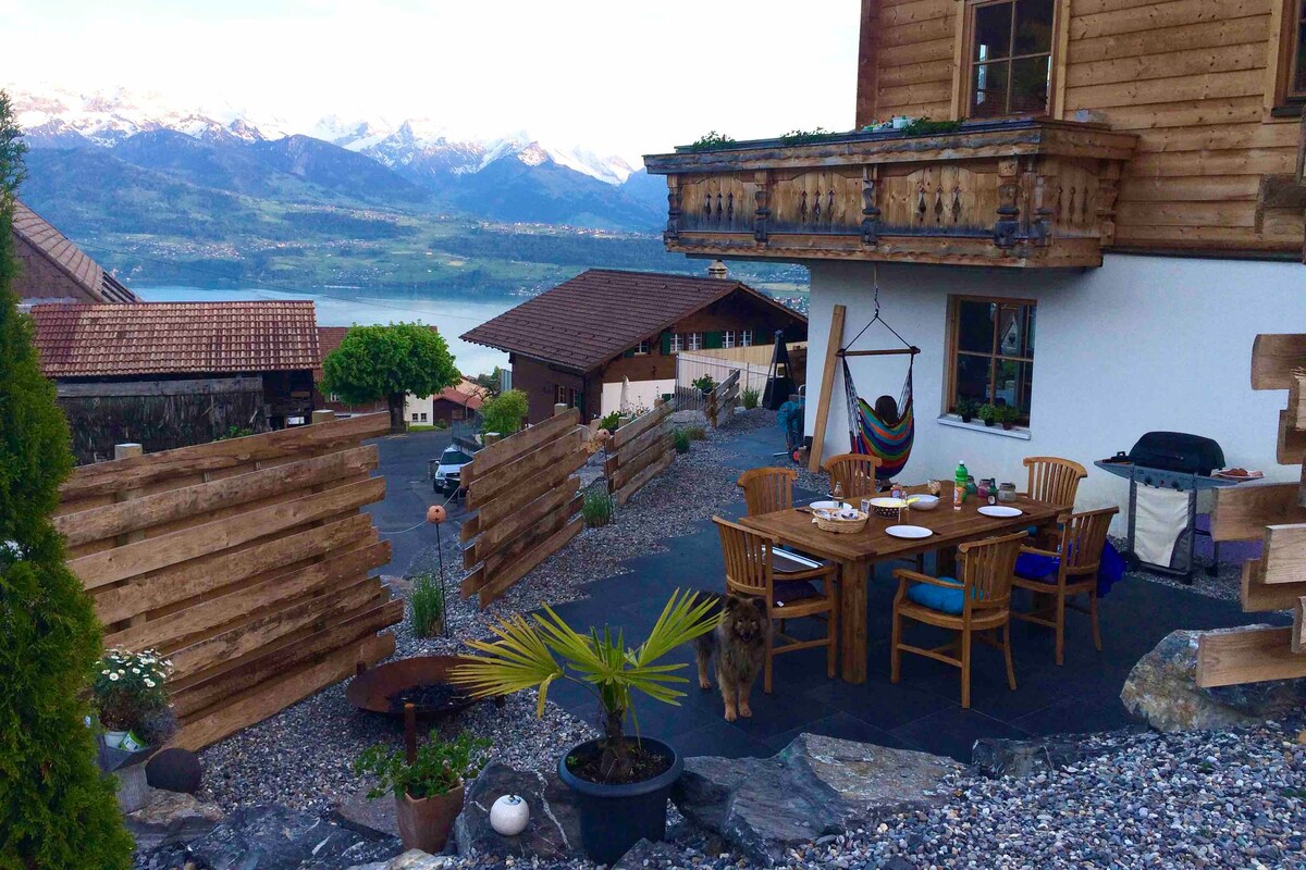 Panoramic views of Lake Thun & the Jungfrau Alps · Spacious private two-storey, 2-bedroom chalet apartment · Ideal for families seeking peace and space near Interlaken Wake up to breathtaking views of Lake Thun and the Jungfrau from 2 large south-facing balconies on both floors. This private apartment is part of an authentic Swiss chalet (Chalet Xanadu), offering peace, space and privacy in a quiet, non-touristic area, ideal for families and guests seeking a relaxing nature retreat.