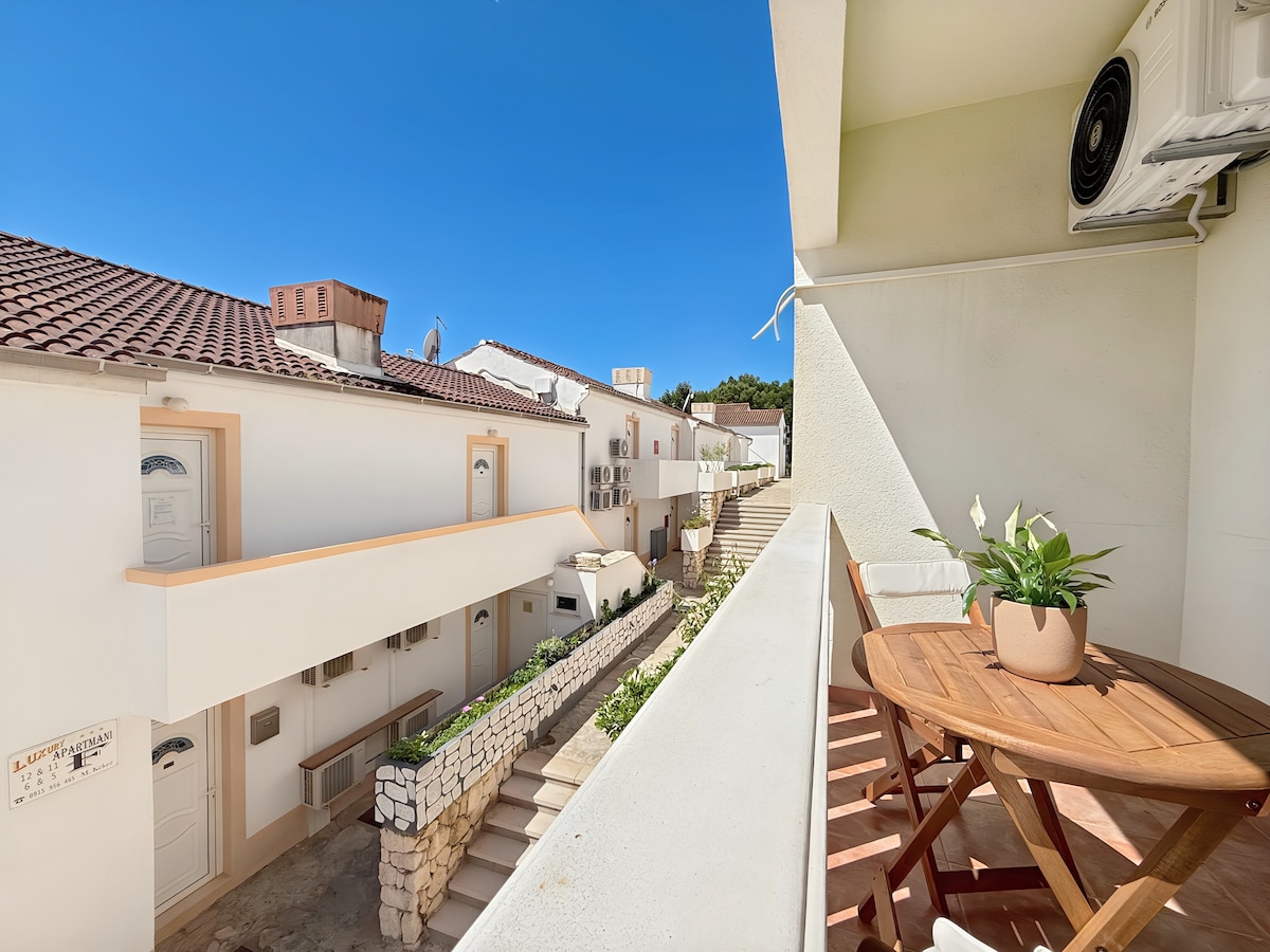 Penthouse Suite is located on the 2nd floor and it have 100m2. It consists of three bedrooms with large double bed and TV. In the hall are bathroom and toilet. One of bedroom has a makeup table and its own bathroom and exit to the balcony connecting the rest of the apartment. Kitchen has a window overlooking the sea and high table with high chairs and also there is dining table with chairs. From the living room you come out to a large spacious balcony. All rooms have air conditioning.