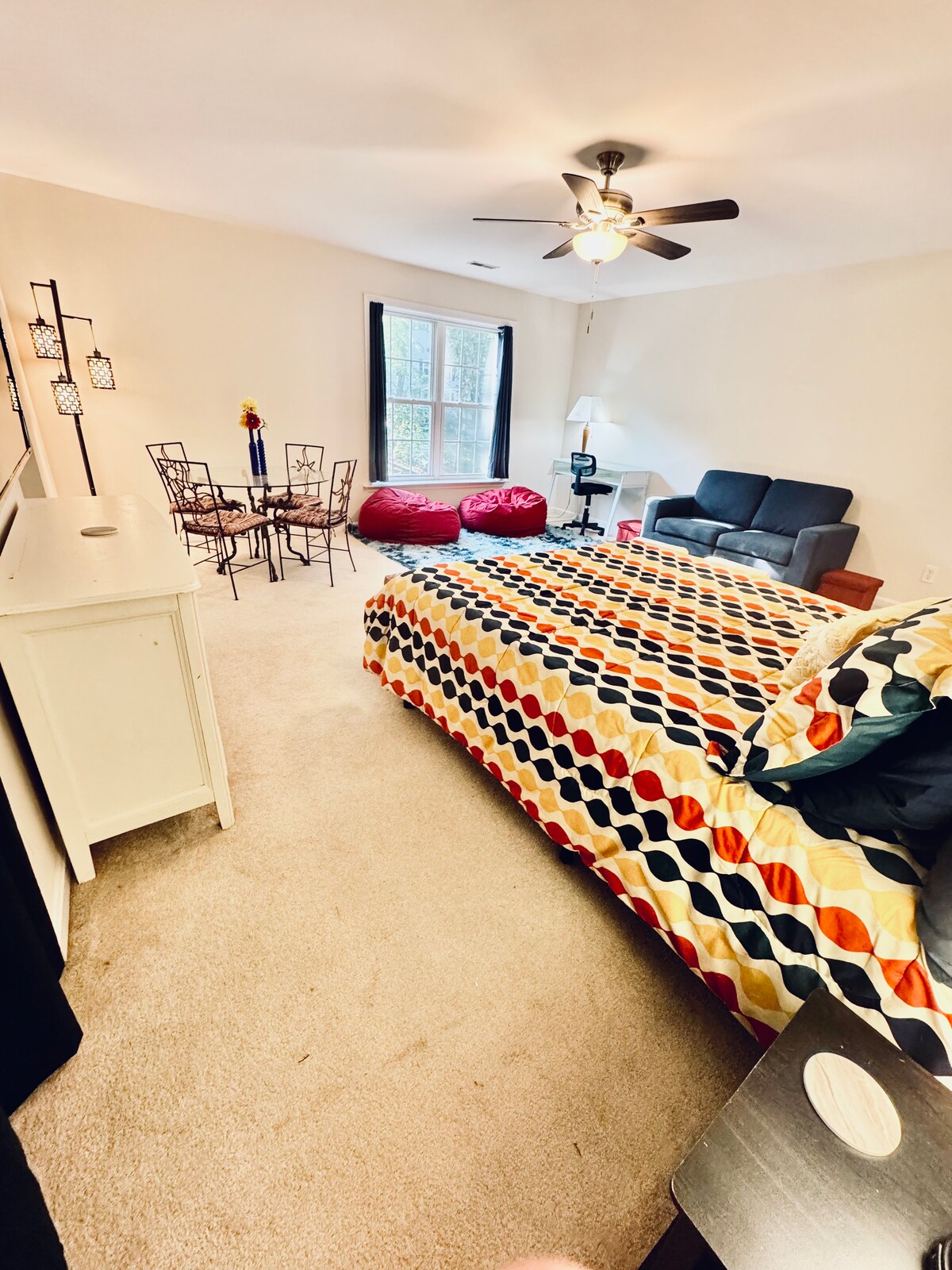 Phòng dành cho khách được trang trí ấm áp của chúng tôi được gắn liền nhưng hoàn toàn tách biệt với phần chính của nhà chúng tôi, với lối vào riêng. Phòng bao gồm phòng ngủ rộng rãi, phòng tắm lớn và khu vực sinh hoạt/ngủ riêng biệt với TV, tủ lạnh mini/tủ đông, lò vi sóng và Keurig. Một phòng giặt là liền kề có sẵn để bạn sử dụng theo yêu cầu (FOC). Sàn nhỏ, sân hiên và sân có hàng rào đầy đủ được bao gồm để bạn sử dụng độc quyền. Có chỗ đỗ xe trên đường phố ngay trước nhà chúng tôi.
