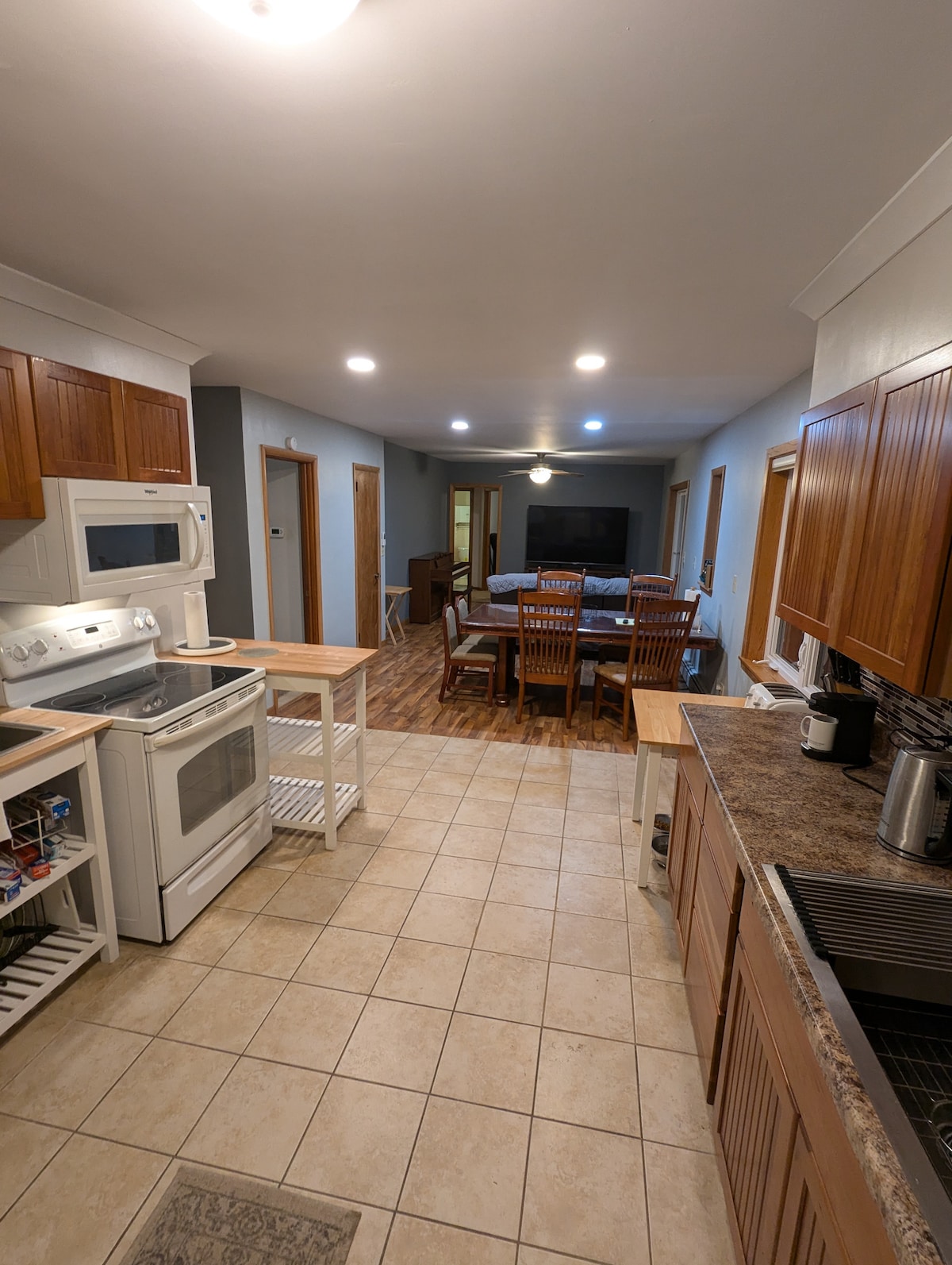 Mở cửa trước và rẽ phải để vào phòng tầng chính mới được cập nhật hoàn chỉnh với 2 phòng ngủ, không gian sinh hoạt và ăn uống, góc chơi ván, bếp đầy đủ với các thiết bị và dụng cụ nấu ăn và phòng tắm đầy đủ đồ vệ sinh cá nhân. Ra khỏi nhà bếp, bạn có thể lựa chọn tận hưởng sân sau riêng bên ngoài hoặc đi xuống tầng dưới và sử dụng máy giặt và máy sấy. Vui lòng nhận ra đây là căn hộ 2 tầng. Tôi đang phục vụ khách cả ở tầng trên và tầng dưới và sẽ cố gắng hết sức để đáp ứng