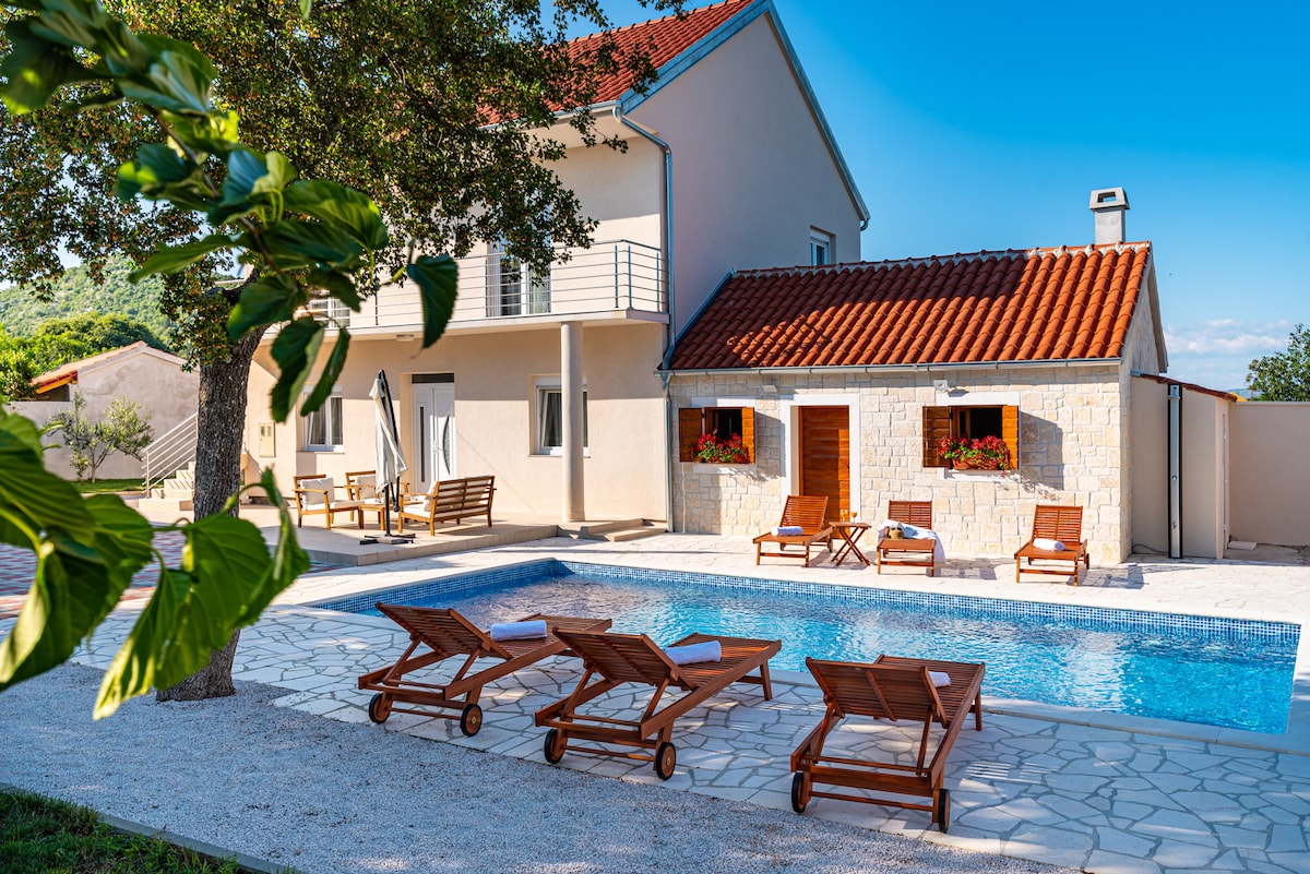 Relax and recharge at Holiday Home Nena, a private countryside escape near the Dalmatian coast. Surrounded by peace and nature, the house offers 3 comfortable bedrooms, a modern living space, and a fully equipped kitchen. Spend your days by the saltwater pool, enjoy BBQ dinners under the stars, and explore nearby beaches just 10 minutes away. Pet-friendly, family-friendly, and designed for pure relaxation.