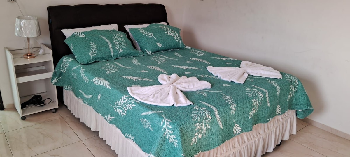 Excelente localização. Residencial familiar, seguro e tranquilo. Um quarto com cama casal queen, cozinha, banheiro, área de ventilação e uma sala onde se pode adicionar uma cama de solteiro. Próximo ao corpo de bombeiros, supermercado, farmácias e lojas diversas.
