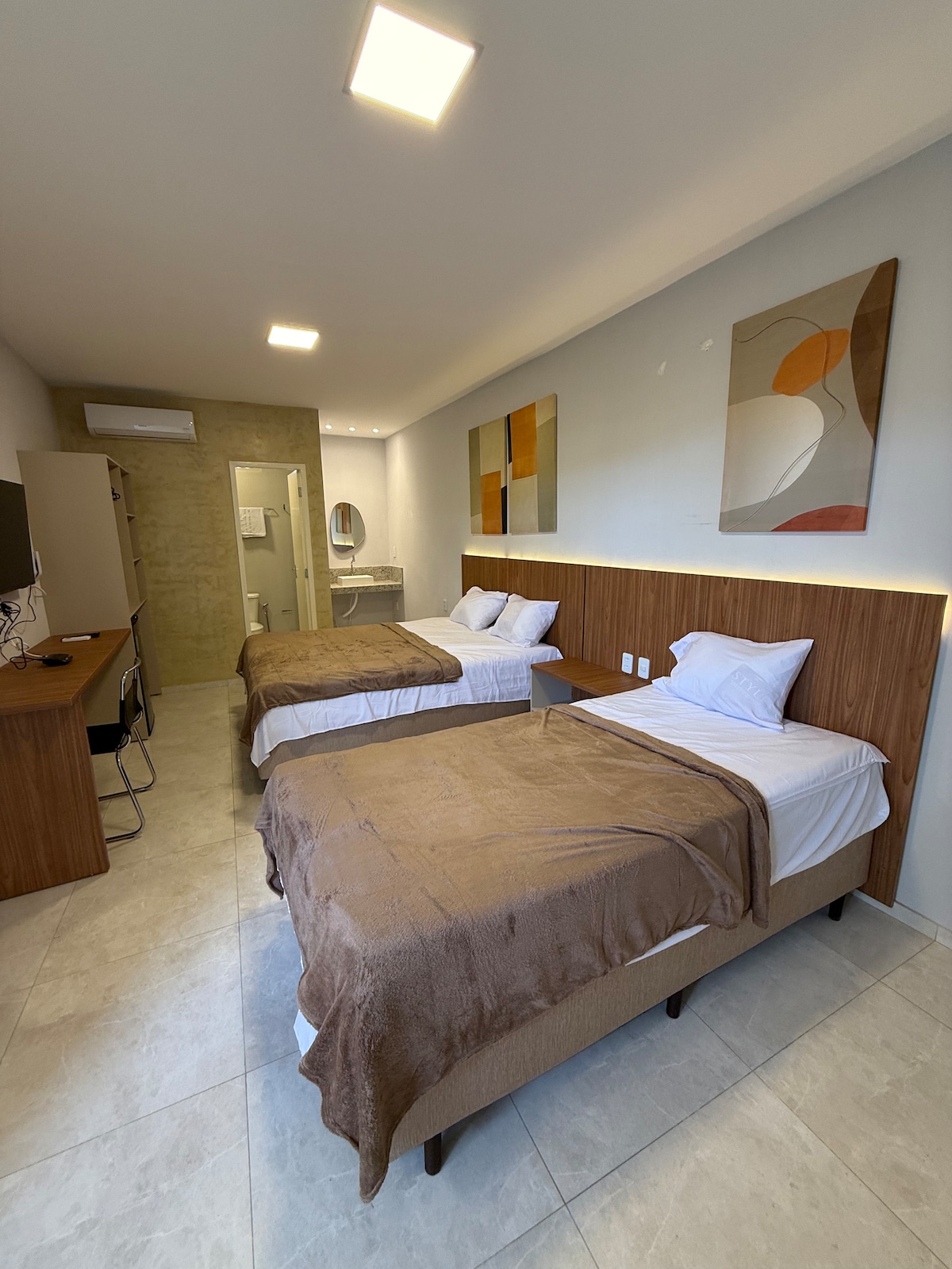 Quarto duplo confortável e bem equipado, ideal para casais ou duas pessoas. Conta com cama de casal aconchegante, ambiente climatizado com ar-condicionado e excelente aproveitamento de espaço. Possui Smart TV, Wi-Fi, frigobar e mesa de apoio para estudo ou trabalho. Dispõe de espelho de corpo inteiro e espelho de maquiagem. Banheiro com chuveiro de água quente. Café da manhã incluso. Localização central e prática.