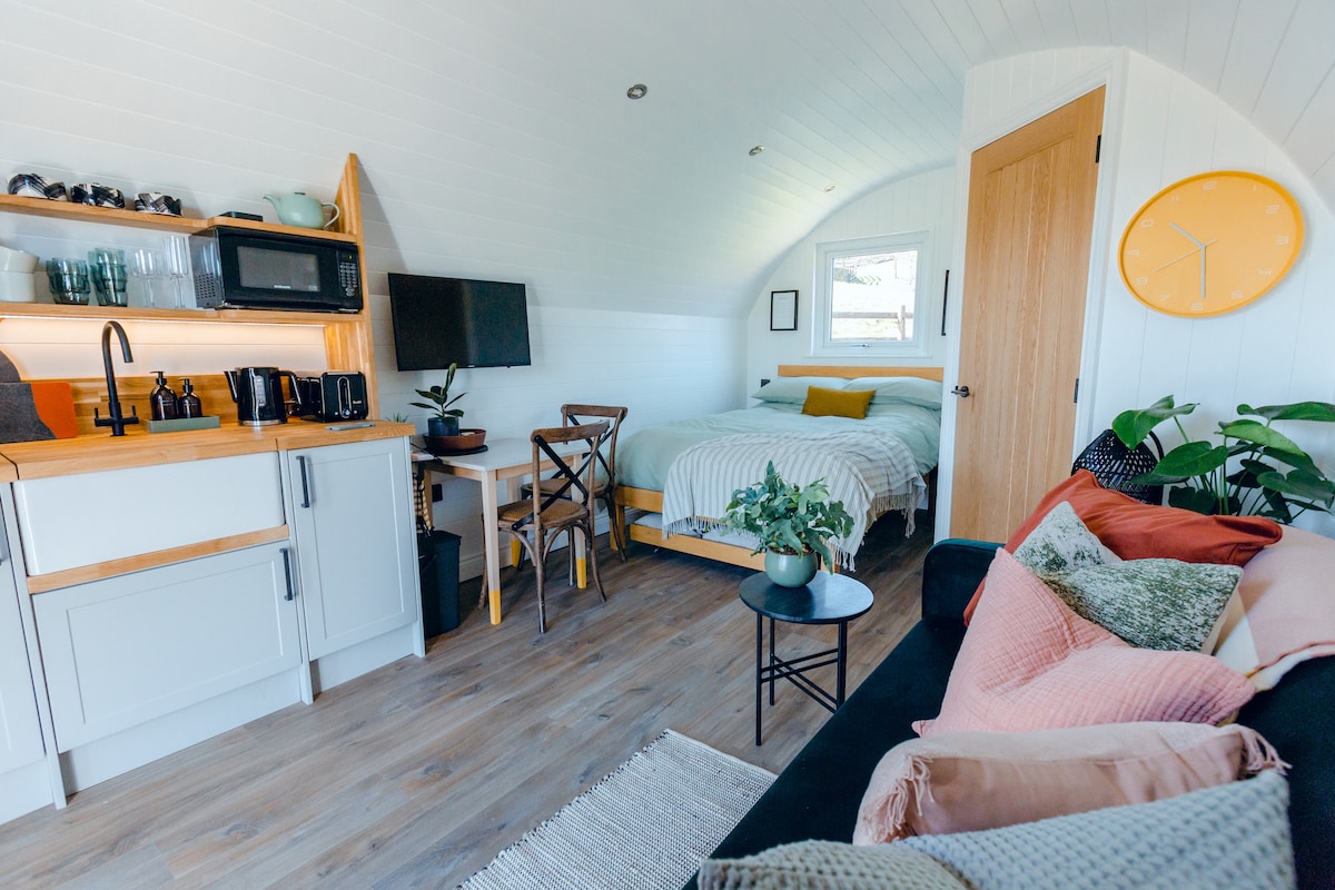 Orchard là Shepherd 's Hut được xây dựng theo phong cách sang trọng của chúng tôi cho hai người, nằm trong một trang trại đang hoạt động được bao quanh bởi thiên nhiên bình dị. Tận hưởng tầm nhìn tuyệt vời ra vùng nông thôn xung quanh, một vị trí yên tĩnh hoàn hảo. Được chỉ định theo tiêu chuẩn cao với hệ thống sưởi dưới sàn, không gian sống không gian mở khá lớn có nhà bếp, lò nướng, bếp, bàn ăn, TV thông minh và giường đôi được trang bị riêng. Phòng tắm khép kín với vòi sen sang trọng. Khu vực chỗ ngồi ngoài trời lớn với lò sưởi combi/cánh tay xoay BBQ để bạn thư giãn.