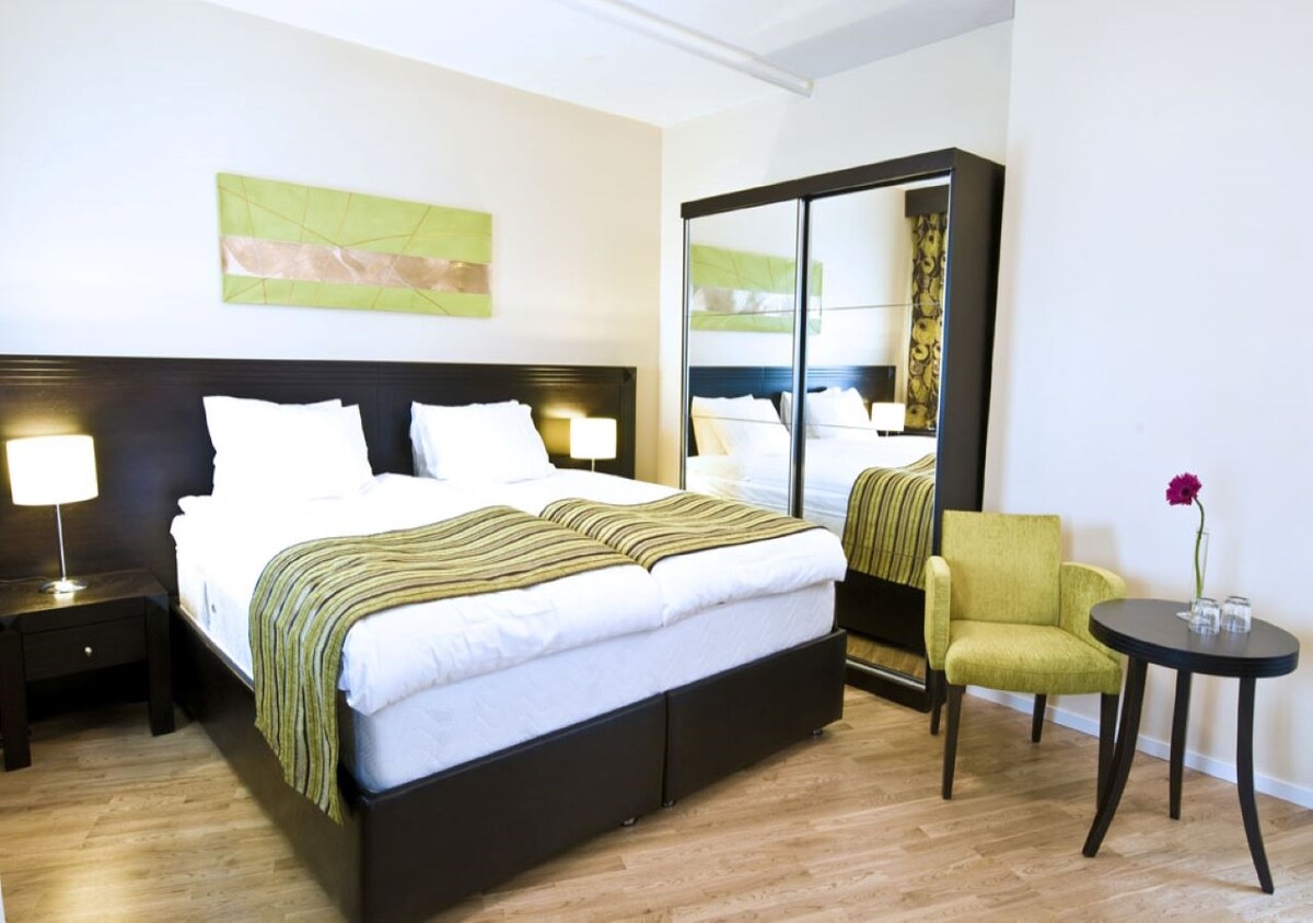 Phòng khách sạn riêng trong một khách sạn mini với các tiêu chuẩn cơ bản ở vị trí rất trung tâm. Sạch sẽ, tươi mới và hiện đại. Phòng này có hai giường đơn và phòng tắm riêng. - Wifi miễn phí - Giường có khăn trải giường và khăn tắm được cung cấp - Máy sấy tóc - Đồ vệ sinh cá nhân miễn phí - Cà phê và trà miễn phí ở hành lang -Bàn là và cầu là ở hành lang - Không gian làm việc với phòng cho máy tính xách tay ở hành lang Xin lưu Ý: Phòng cách một cầu thang lên. Cầu thang hẹp và bạn có thể phải vật lộn với vali lớn.