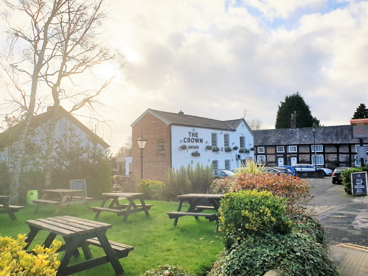 Đẹp, sang trọng, sáng sủa, rộng rãi, phủ gạch đen Garden Bothy. Tự chứa. Cửa đôi mở ra một sân thượng lớn hướng về phía nam nhìn ra ngoài với tầm nhìn đáng yêu ra đất nông nghiệp của chúng tôi. Giường đôi, ga trải giường có chỉ số sợi cao và khăn tắm dồi dào. Phòng tắm sang trọng hiện đại với vòi sen lớn. Khoảng cách đi bộ/lái xe ngắn đến Địa điểm tổ chức đám cưới Merrydale Manor và chưa đầy 5 phút lái xe đến Colshaw Hall. Có thể đi bộ đến quán rượu ‘The Dog’ tuyệt vời. Có thể đi bộ đến ga tàu chính đến Manchester- Crewe.