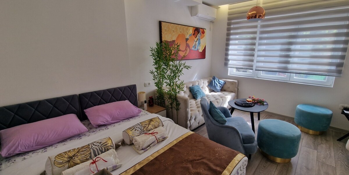 Studio hiện đại và ấm cúng cho 2 người, với giường đôi (có thể tách ra), giường sofa cho khách thứ ba và giường em bé miễn phí. Được trang bị đầy đủ TV, điều hòa, máy rửa bát, máy pha cà phê và tủ lạnh. Ở tầng 1, có bãi đậu xe gần đó. Trong một khu vực cây xanh yên tĩnh, khoảng cách đi bộ đến các cửa hàng, nhà hàng và điểm tham quan thành phố. Trang trí ấm áp làm tăng thêm sự quyến rũ.