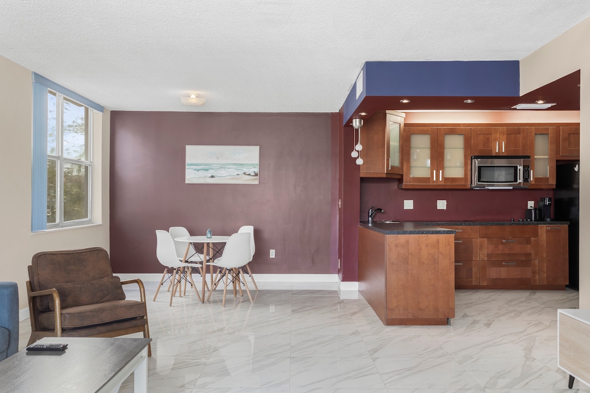 ** CĂN HỘ PHỔ BIẾN NHẤT CỦA CHÚNG TÔI ** Căn hộ được cải tạo đẹp mắt ở Bãi biển Miami, trong một khu phố yên tĩnh và an toàn chỉ cách đại dương vài bước chân. Căn hộ này cung cấp chỗ ở riêng và yên tĩnh cho khách du lịch và khách đi công tác. Căn hộ có giường queen thoải mái, móc treo, lò vi sóng, tủ lạnh kích thước đầy đủ, bếp nhỏ, TV thông minh, Wi-Fi miễn phí và điều hòa mới.