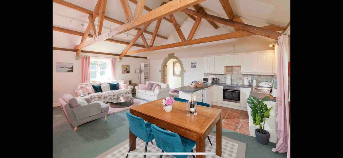 Relaxed, gorgeous, converted barn with vaulted & beamed, open-plan sitting-dining room & kitchen. 2 en-suite bedrooms. Please note: Master bedroom can have a superking bed OR 2 twin beds, not both as the Airbnb title can be a bit misleading! There are a further 2 single beds in the second bedroom. In the sitting room there is a king-size sofabed for 2 people. Salisbury, Stonehenge, Bath Shaftesbury. Walks, views, cycling, history, meditation, foodie pubs. Space to stretch out, lovely views.