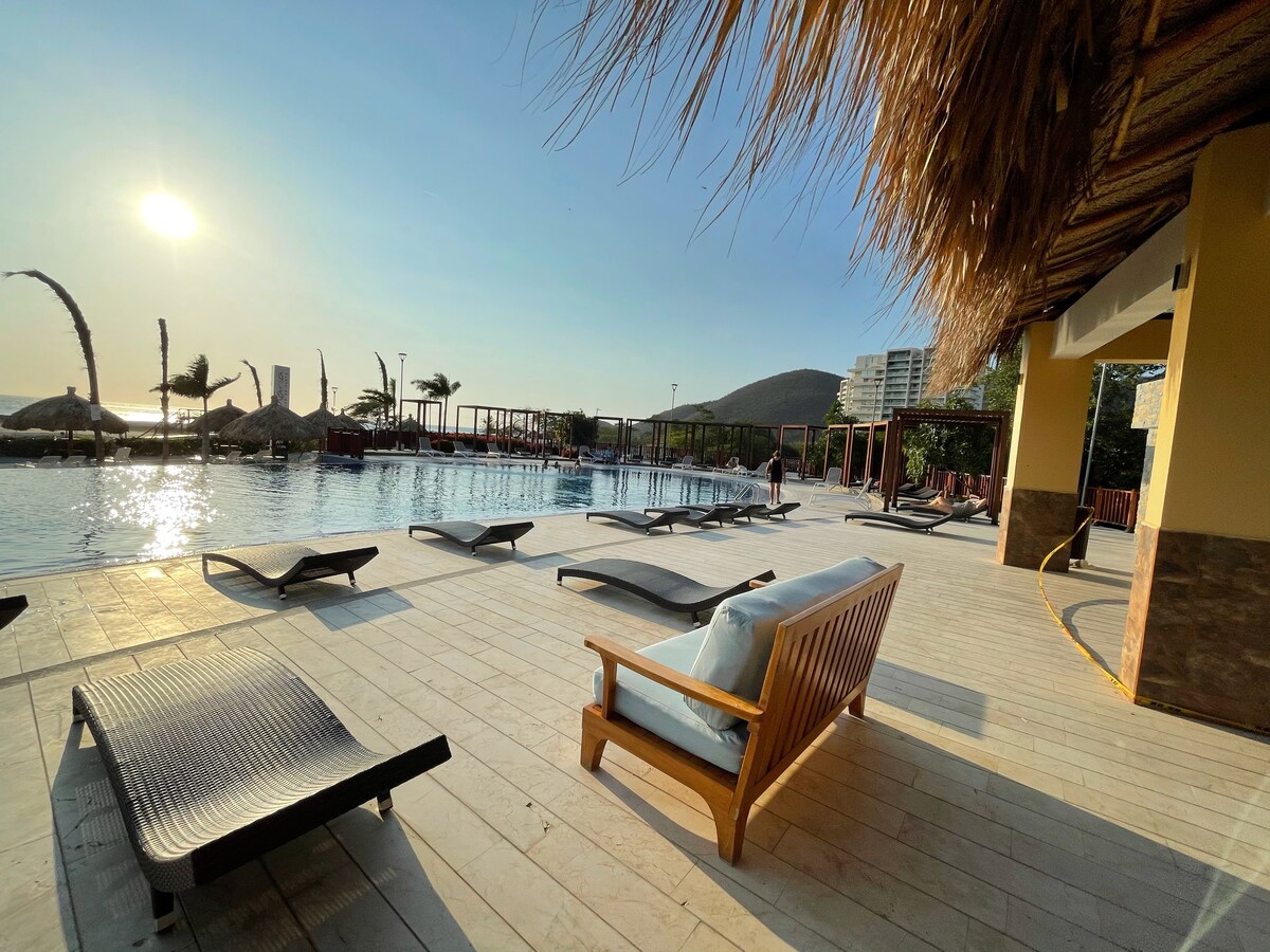 Tận hưởng một căn hộ sang trọng hướng biển, trong khu vực ưa thích của rodadero, nằm cách Sân bay Quốc tế Simon Bolivar 15 phút. Đây là một khu nghỉ dưỡng độc quyền có lối đi thẳng ra bãi biển, với tầm nhìn tuyệt đẹp, tự hào có phòng sáng sủa, ban công riêng, phòng ngủ chính với giường cỡ king và nhà bếp được trang bị. Khu nghỉ dưỡng có hồ bơi, bể sục, phòng tập thể dục, nhà hàng, quán bar và bảo vệ 24/7. Lý tưởng cho các gia đình hoặc cặp đôi, nó kết hợp sự thoải mái, thanh lịch. Đặt chỗ ở của bạn ngay bây giờ!