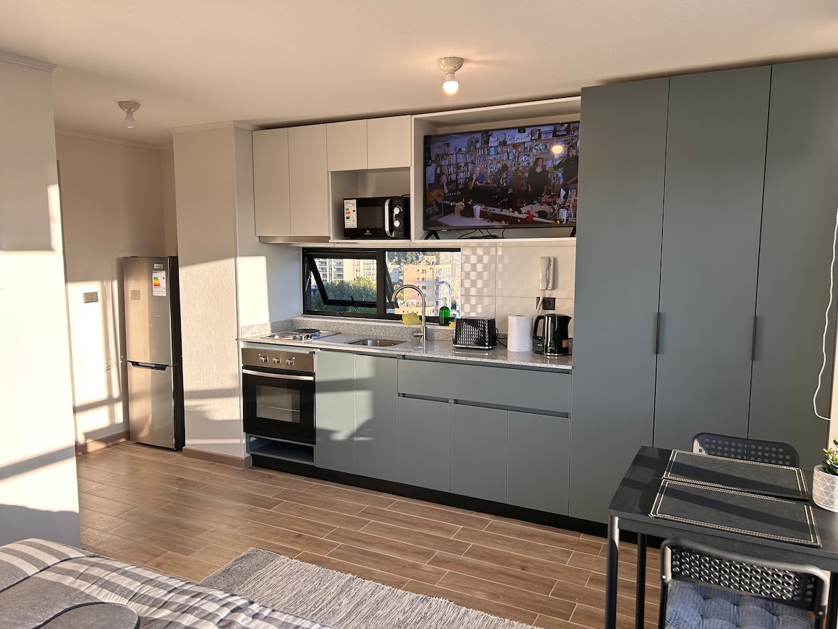 Tận hưởng studio của chúng tôi ngay trung tâm Concepción, gần các trường đại học, giao thông, trung tâm thương mại và nhà hàng. Lý tưởng cho hai người, căn hộ bao gồm giường hai chỗ ngồi, nhà bếp được trang bị, phòng tắm có bồn tắm, TV thông minh và bàn làm việc/ăn uống. Tòa nhà có phòng tập thể dục, phòng làm việc chung, phòng giao hàng, phòng giặt ủi, phòng toàn cảnh và phòng chờ dành cho người sành ăn. Tiện lợi và thoải mái ở một vị trí trung tâm! Không có chỗ đỗ xe cụ thể của chỗ ở.