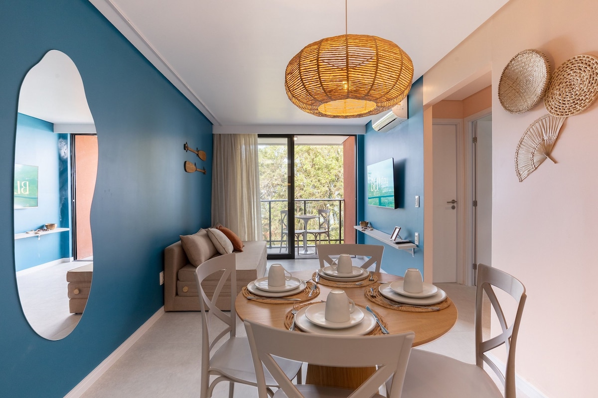 🏡 Flat moderno e super aconchegante! Espaço completo com 2 quartos (1 cama queen, 1 cama casal) e sofá-cama na sala — acomoda até 6 pessoas com conforto. Cozinha americana toda equipada, banheiro com pia em pedra, roupa de cama e toalhas inclusas. O prédio é incrível: garagem coberta, portaria 24h, coworking, lavanderia e rooftop com academia, sala de jogos, espaços gourmet e 4 piscinas com vista. ☀️ Perfeito pra relaxar, curtir e se sentir em casa! 💛