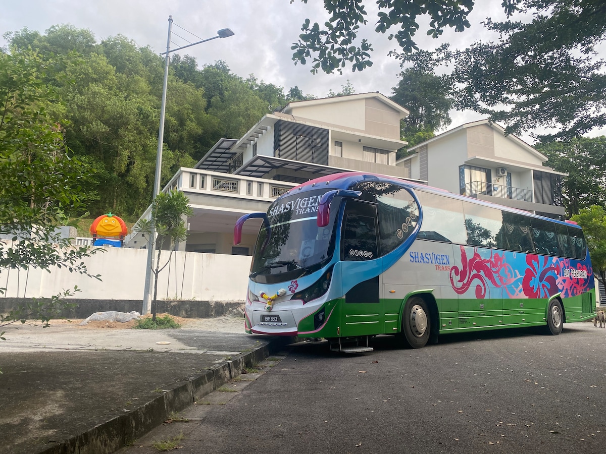 3 Storey Villa on 10000 SQFT land, 10 rooms 12 bathrooms, 2 private entrances, 2 private facilities for two private teams. Can book(One or Half) villa. Offers accommodation & events, for Family Friend Student Company Wedding Birthday. Big site can canopy to 200 ppl gathering .Two private kids pool with slide/fun toys. BBQ pit. Air-conditioned in all rooms &WIFI. Guests can enjoy meals at Golden Triangle/PISA corner/Bayan Baru with choices. SPICE/QUEENBAY mall/Penang Hill ~10 minutes drive
